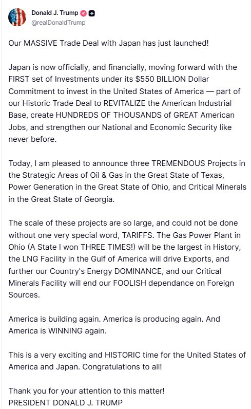 ABD Başkanı Donald Trump, sosyal medya hesabından yayınladığı mesajda Japonya ile varılan ticaret anlaşması hakkında açıklamalarda bulundu. Temmuz ayında varılan “devasa” ticaret anlaşmasının resmen hayata geçtiğini belirten Trump, “Japonya, ABD’ye 550 milyar dolarlık yatırım taahhüdünün ilk aşamasını resmen mali olarak hayata geçiriyor. Bu yatırımlar, Amerikan sanayisini canlandırmak, yüz binlerce Amerikalıya istihdam sağlamak ve ulusal ve ekonomik güvenliğimizi daha önce hiç olmadığı kadar güçlendirmek için imzaladığımız tarihi ticaret anlaşmamızın bir parçasıdır” değerlendirmesinde bulundu.