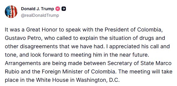 ABD Başkanı Donald Trump, Kolombiya Devlet Başkanı Gustavo Petro ile telefon görüşmesi gerçekleştirdiğini duyurarak, “Beni aramasını ve üslubunu takdir ettim. Yakın gelecekte kendisiyle görüşmeyi sabırsızlıkla bekliyorum” açıklamasında bulundu. Trump, Petro’nun Beyaz Saray’a yapacağı ziyaret için hazırlıklara başlandığını söyledi.
