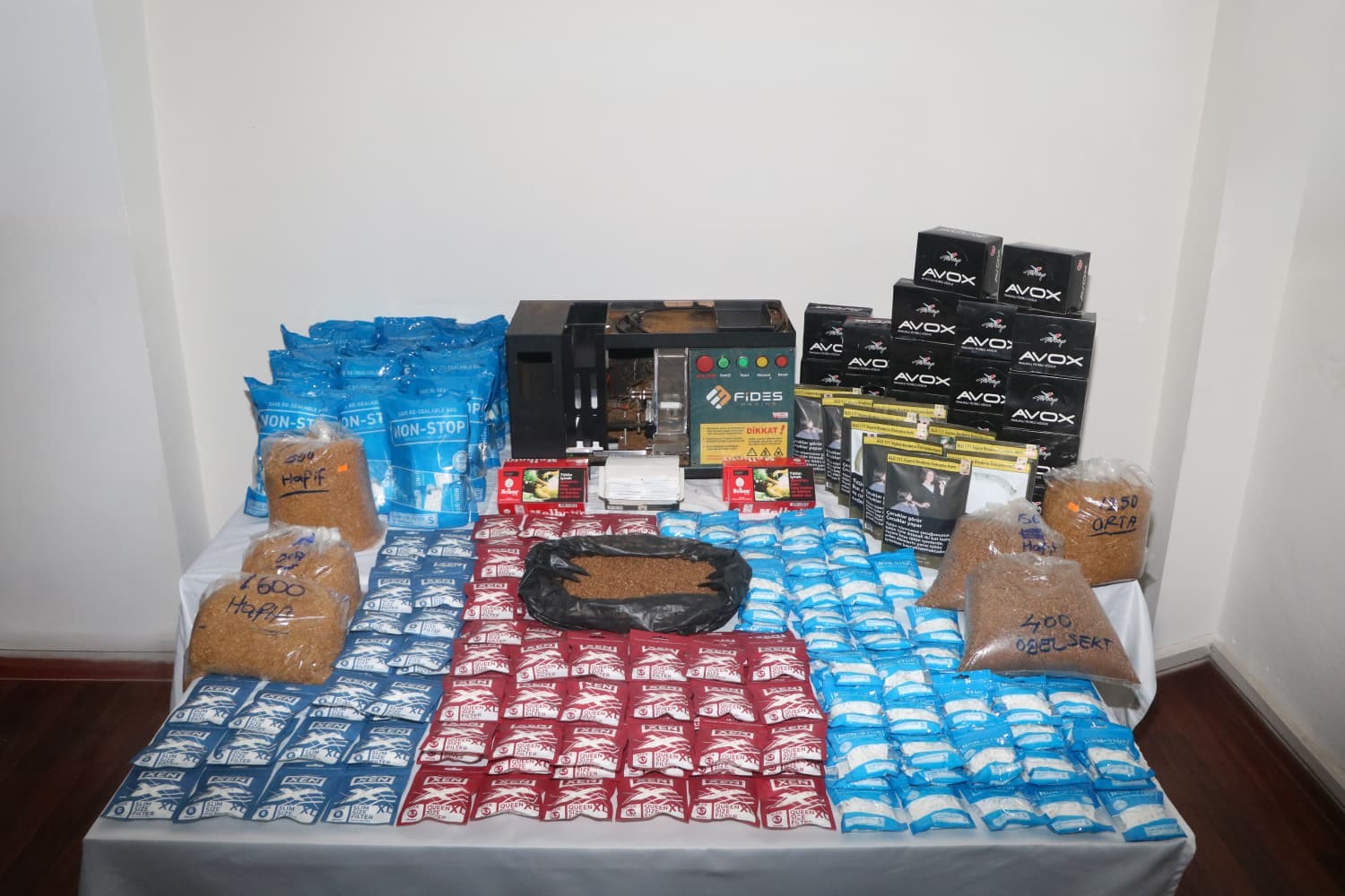 Operasyonlar kapsamında yapılan aramalarda; 1 adet elektrikli sigara sarma makinesi, 181 bin 940 adet sigara filtresi, 12 bin 877 gram kıyılmış sarmalık tütün, 907 adet makaron, 20 litre etil alkol, 5 adet alkol aroma kiti, 14 adet doluma hazır alkol şişesi, 1 adet ruhsatsız av tüfeği ele geçirildi.