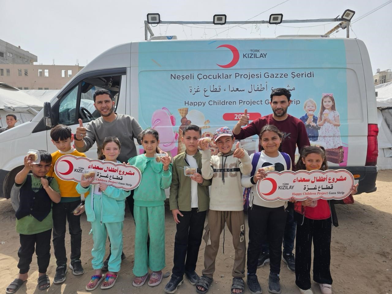Gazze’de Türk Kızılay tarafından çocuklara yönelik yürütülen ‘Neşeli Çocuklar Projesi’ kapsamında günlük bin çocuğa şekerleme, tatlı ve atıştırmalık ulaştırılıyor. Dağıtımlar mobil araçla farklı noktalarda gerçekleştiriliyor. Proje, yalnızca ayni destek değil, çocuklara moral ve psikososyal destek sağlayan bir çalışma niteliği amaçlıyor.