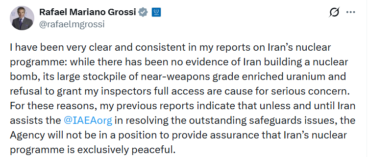 Uluslararası Atom Enerjisi Ajansı (UAEA) Başkanı Rafael Grossi, İran’ın nükleer bomba ürettiğine dair bir kanıtın bulunmadığını yineleyerek, “Buna rağmen,