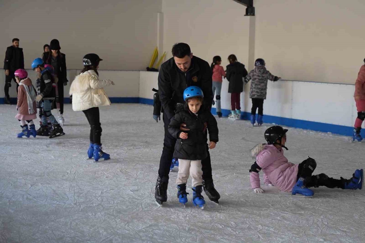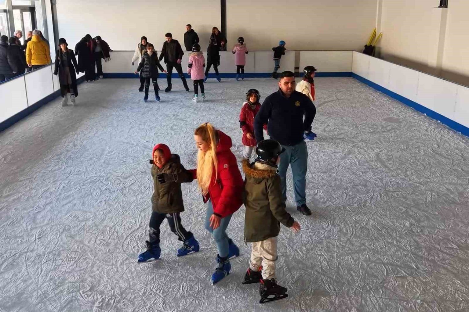 Kırıkkale’de karnesini getiren çocuklar, ücretsiz buz pistinde paten kaymanın keyfini yaşadı.