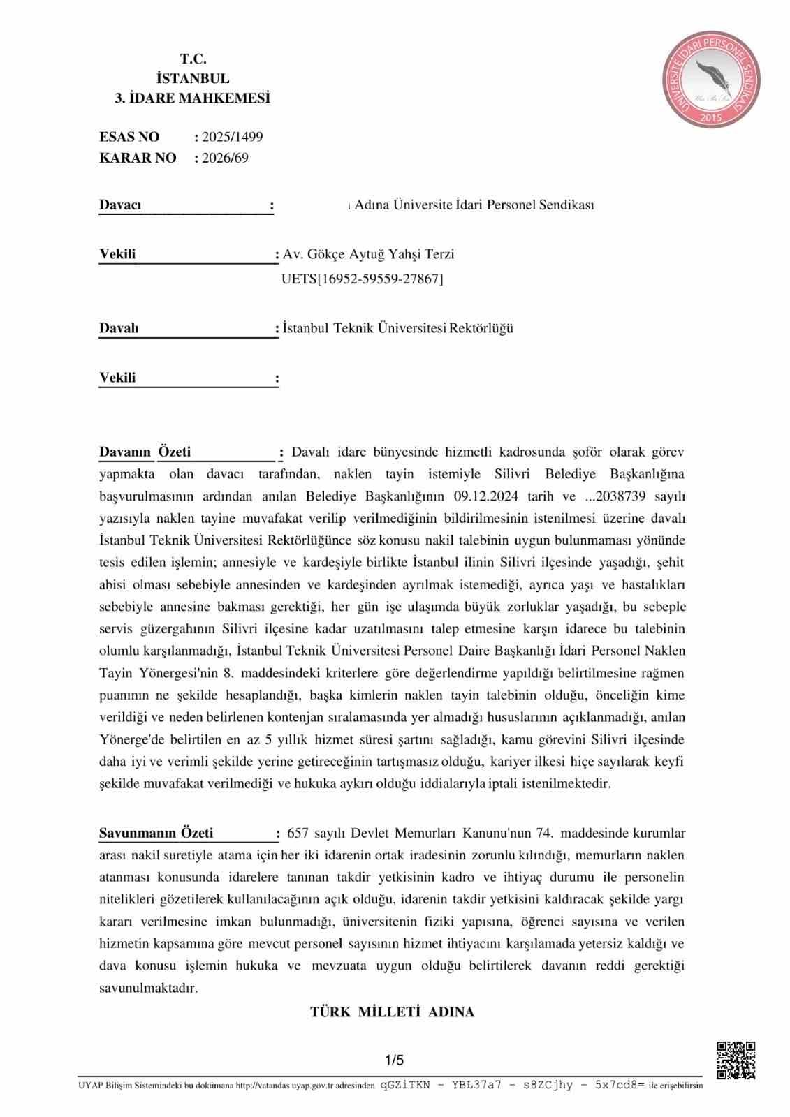 ÜNİPERSEN’den yapılan açıklamaya göre, İstanbul Teknik Üniversitesi bünyesinde hizmetli kadrosunda şoför olarak görev yapan sendika üyesi, Silivri Belediye Başkanlığı’na naklen atanma talebinde bulundu. İdare tarafından talebe muvafakat verilmemesi üzerine açılan dava, İstanbul 3. İdare Mahkemesi tarafından karara bağlandı. Mahkeme, 20 Ocak 2026 tarihli kararında ret işlemini iptal edildi.