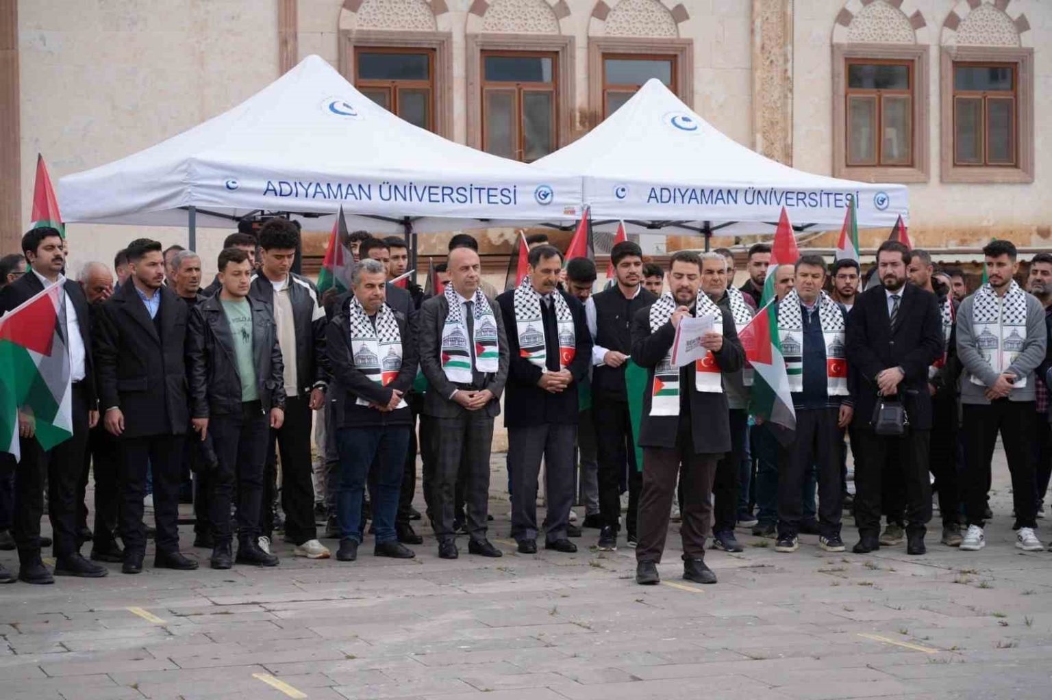 İyiliğin Geleceği Öğrenci Topluluğu tarafından düzenlenen açıklamaya, Adıyaman Üniversitesi Rektörü Prof. Dr. Mehmet Keleş, üniversitenin akademik ve idari personeli ile çok sayıda öğrenci katıldı.