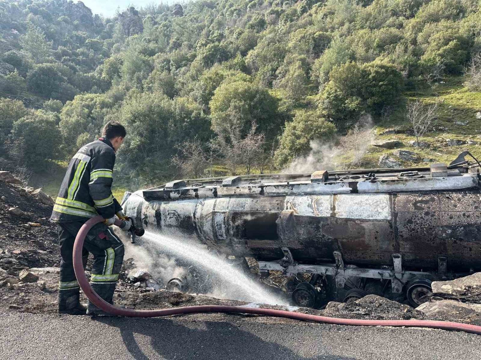 Kaza, İzmir-Uşak karayolu Yenişehir rampalarında meydana geldi. Edinilen bilgilere göre, Saim Kurt (56) idaresindeki 06 CC 3848 plakalı mazot yüklü akaryakıt tankeri, sürücüsünün direksiyon hakimiyetini kaybetmesi sonucu kontrolden çıkarak şarampole devrildi. Devrilmenin ardından tankerde yangın çıktı. Kısa sürede büyüyen alevler tüm tankeri sardı.