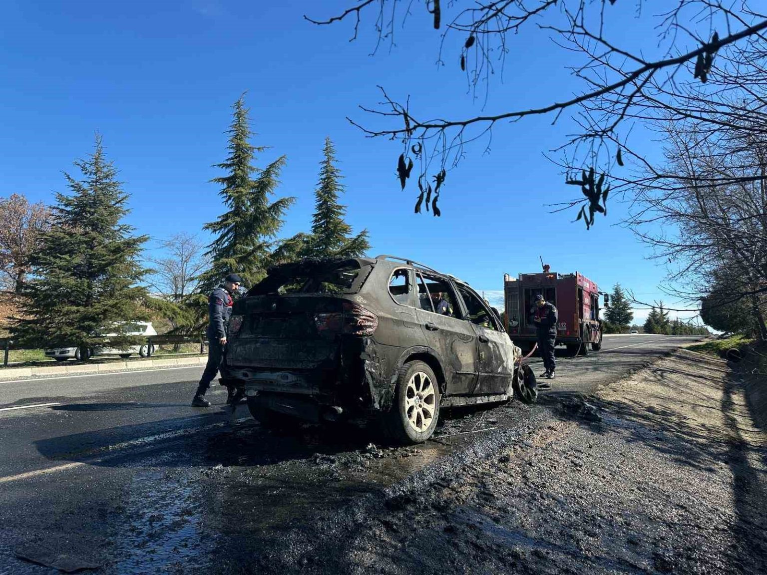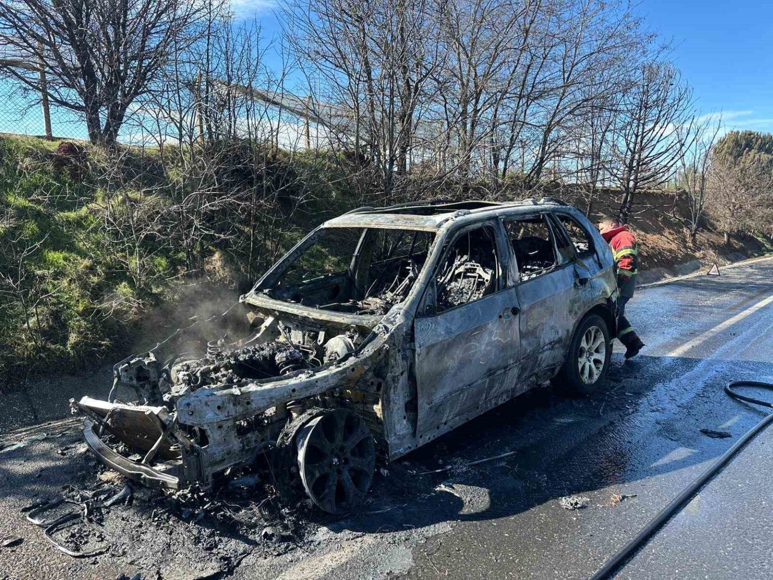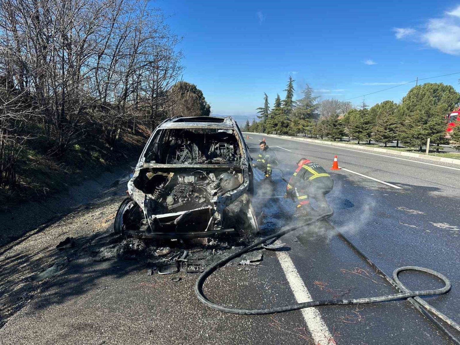 Uşak’ta seyir halindeyken arızalanan cip, emniyet şeridine çekildikten sonra çıkan yangında tamamen yanarak kullanılamaz hale geldi.