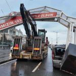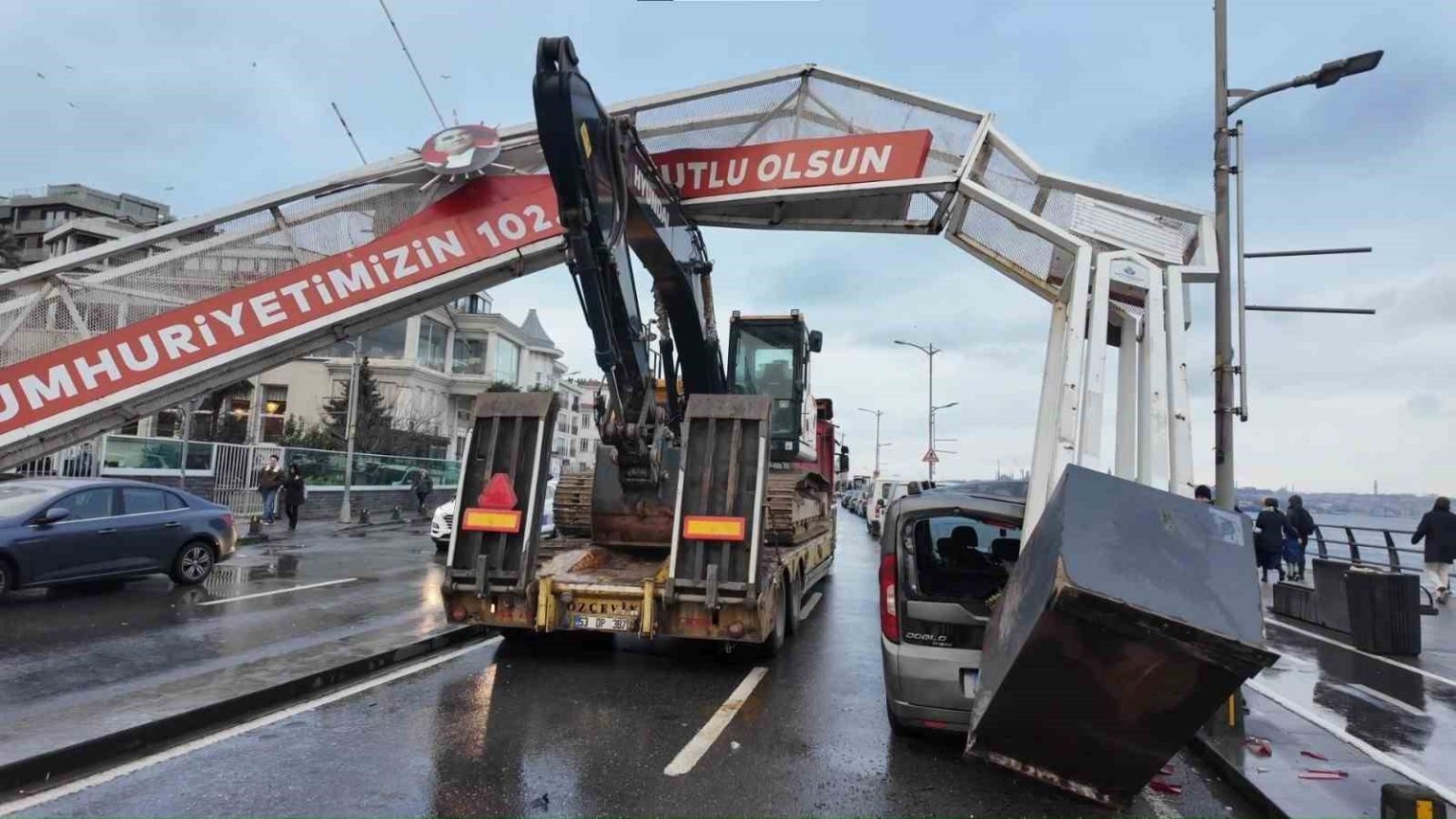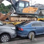 Üsküdar’da seyir halinde bulunan bir tırın üstünde taşınan ekskavatörün yol üzerindeki tabelaya çarpıp düşmesi nedeniyle 7 araçta maddi hasar meydana geldi.