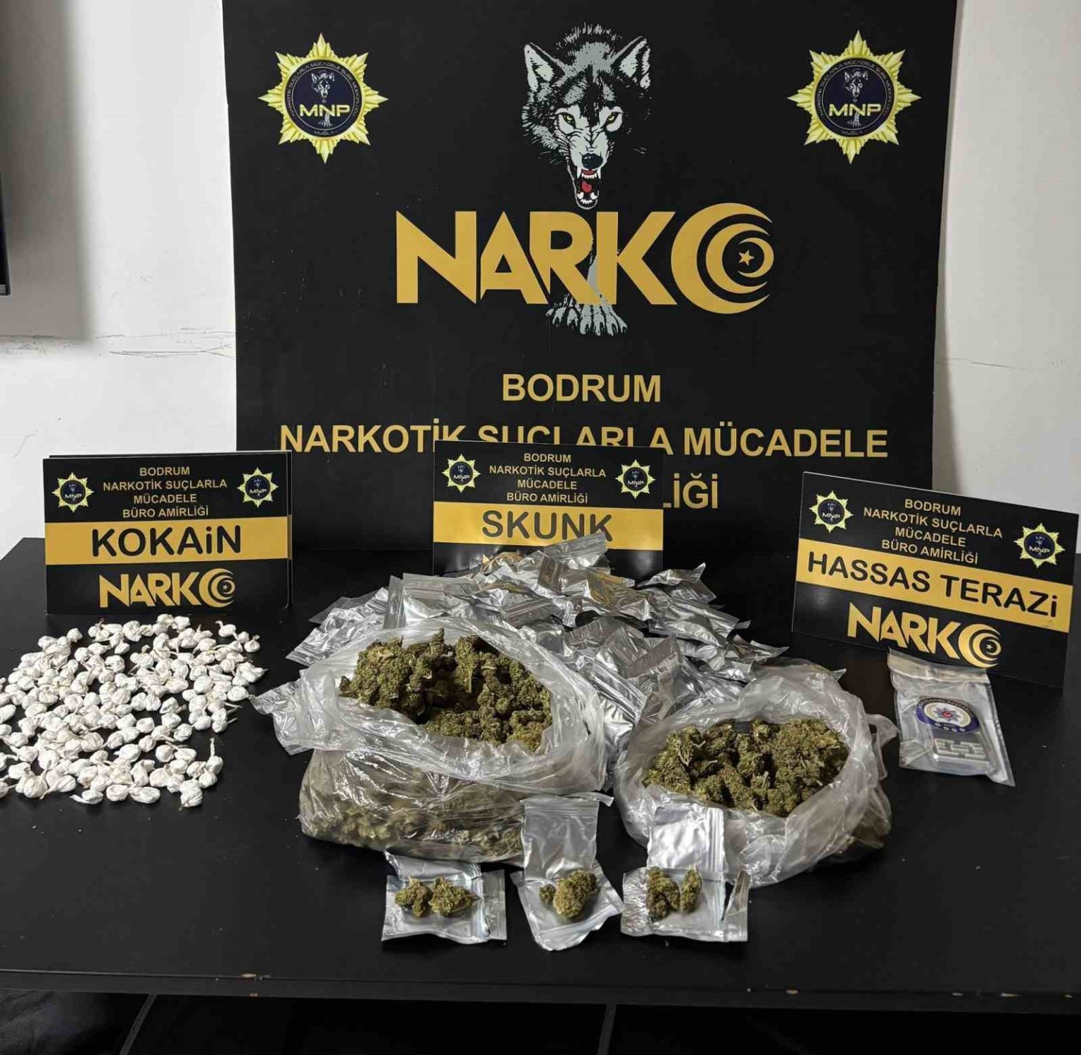 Bodrum Narkotik Suçlarla Mücadele Büro Amirliği ekiplerince uyuşturucu madde ticaretinin engellenmesine yönelik teknik ve fiziki takip başlatıldı. Şüphelilerin belirlenen adreslerde uyuşturucu madde depoladığı ve satışını gerçekleştirdiği bilgisini alan ekipler, operasyon için düğmeye bastı. Şüphelilerin ikametlerinde ve eklentilerinde yapılan detaylı aramalarda; 909 gram skunk, 133 gram kokain ve uyuşturucu tartımında kullanıldığı değerlendirilen 1 adet hassas terazi ele geçirildi. Operasyon kapsamında gözaltına alınan ve haklarında “Uyuşturucu veya Uyarıcı Madde İmal ve Ticareti” (TCK-188) suçundan işlem yapılan 3 şüpheli, emniyetteki işlemlerinin ardından adliyeye sevk edildi. Çıkarıldıkları mahkemece tutuklanan 3 şahıs, cezaevine gönderildi.