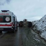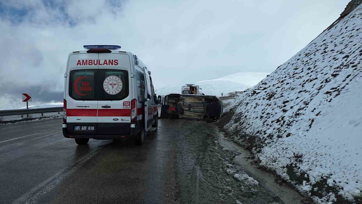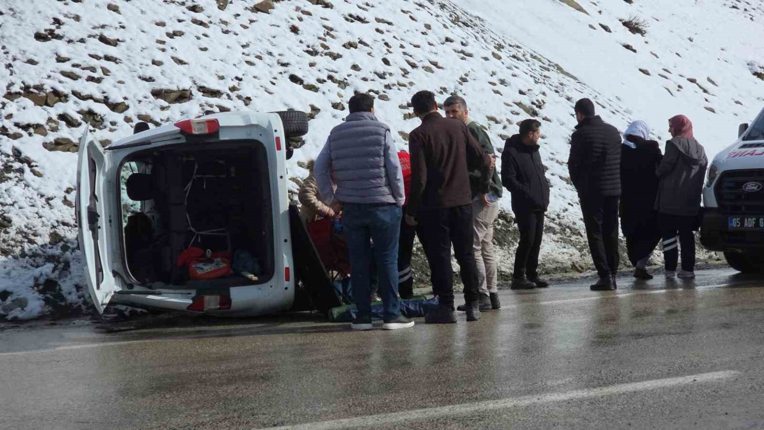 Van’da kaygan yolda devrilen hafif ticari kamyonette 1 kişi yaralanırken sürücü, eşi ve çocuğu yara almadan kurtuldu.