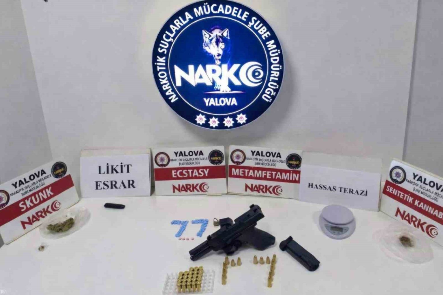 Alınan bilgiye göre, Yalova Emniyeti İstihbarat ve Narkotik Suçlarla Mücadele Şube müdürlüklerince risk-analiz sonucu kent merkezinde gerçekleştirilen operasyonlarda ve İstanbul ilinde yakalattırılan şahıslardan, toplam 242,75 gram çeşitli türlerde uyuşturucu ve uyarıcı madde, 64 adet uyuşturucu hap, hassas terazi, 9 mm çapında tabanca, 1 şarjör ve 39 adet fişek ele geçirildi.