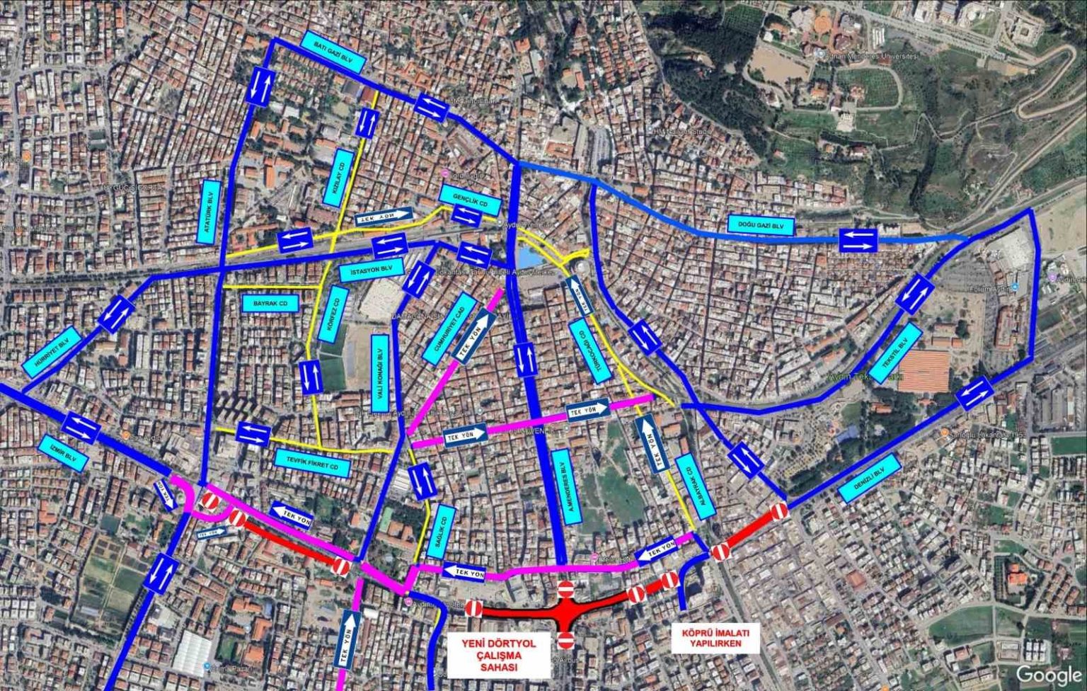 Astim Kavşağı (Denizli Aydın Yolu) – Havaalanı Bulvarı – Afrodisyas Bulvarı – Çevre Bulvarı – Çine Caddesi ya da Atatürk Bulvarı – İzmir Bulvarı’nı kullanacak. İzmir yönünden Denizli yönüne gitmek isteyenler, İzmir Bulvarı – Atatürk Bulvarı – Çevre Bulvarı – Afrodisyas Bulvarı – Havaalanı Bulvarı – Astim Kavşağı (Denizli Aydın Yolu) kullanacak. Güney – Doğu/ Doğu – Güney / Güney – Batı / Batı – Güney Yönleri, Muğla yönünden Denizli yönüne gitmek isteyenler: Muğla Bulvarı – Çevre Bulvarı – Afrodisyas Bulvarı – Havaalanı Bulvarı – Astim Kavşağı (Denizli Aydın Yolu) kullanacak. Denizli yönünden Muğla yönüne gitmek isteyenler, Astim Kavşağı (Denizli Aydın Yolu) – Havaalanı Bulvarı – Afrodisyas Bulvarı – Çevre Bulvarı – Muğla Bulvarı kullanacak. Muğla yönünden İzmir yönüne gitmek isteyenler, Muğla Bulvarı – Çevre Bulvarı ya da Batı Aydın Bulvarı – Çine Caddesi ya da Atatürk Bulvarı – İzmir Bulvarı’nı kullanacak. İzmir yönünden Muğla yönüne gitmek isteyenler, İzmir Bulvarı – Atatürk Bulvarı – Çevre Bulvarı – Muğla Bulvarı’nı kullanacak. Güney – Kuzey / Kuzey – Güney Yönleri, Kuzey yönünden İzmir ve Denizli bulvarlarının güneyine geçmek isteyenler: Adnan Menderes Bulvarı’nın Süleyman Seba Caddesi ile Albay Şefik Caddesi kesişiminden itibaren kapalı olması nedeniyle Atatürk Bulvarı, Sağlık Caddesi, Egemenlik Bulvarı ve Sanayi Caddesi güzergahlarını kullanabilecekler. Güney yönünden İzmir ve Denizli bulvarlarının kuzeyine geçmek isteyenler: Yeni Dörtyol Kavşağı ile İmam Hatip Kavşağı arası kapalı olacağından Tepecik Bulvarı, Egemenlik Bulvarı, 522 Sokak, Mehmet Akif Caddesi, Çine Caddesi ve Atatürk Bulvarı güzergahlarını kullanabilecekler.
