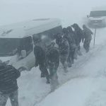 Hakkari’nin Yüksekova ilçesinde taziyeye gitmek için yola çıkan vatandaşlar, kar yağışı ve fırtına nedeniyle yolda mahsur kaldı.