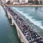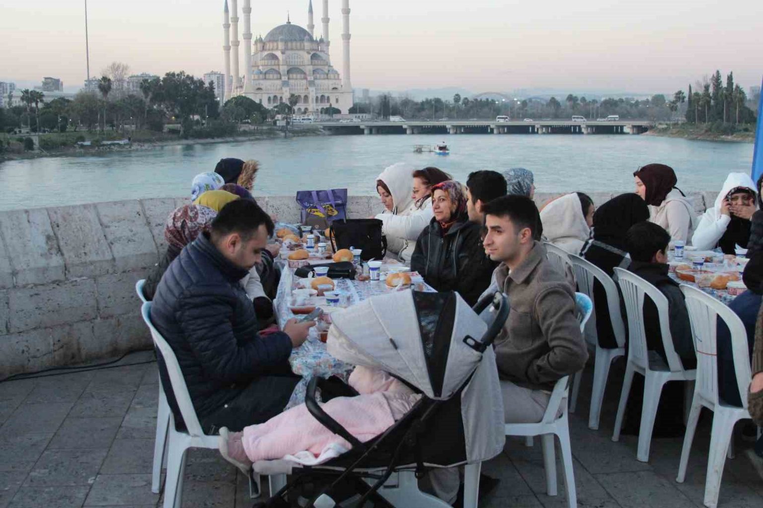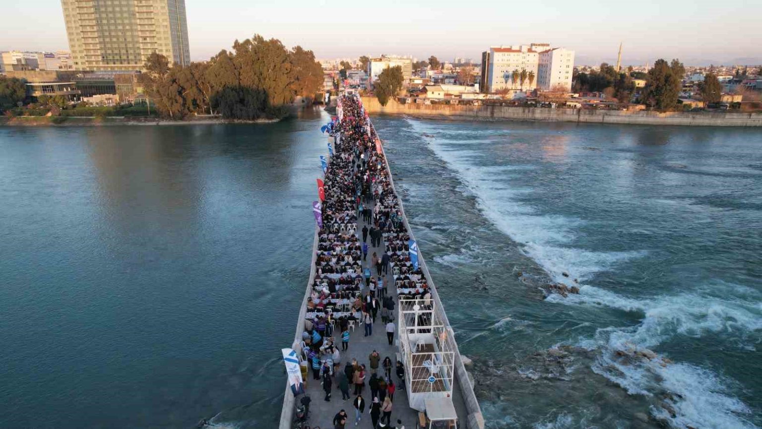 Adana’da Ramazan ayı dolayısıyla Yüreğir Belediyesi tarafından tarihi Taşköprü’de halk iftarı düzenlendi. Tarihi dokusuyla kentin simgelerinden olan Taşköprü üzerinde kurulan uzun sofralarda yüzlerce Adanalı aynı anda orucunu açtı.