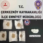 Çerkezköy Emniyet Müdürlüğü Narkotik Suçlarla Mücadele Şubesi ekiplerinin denetim ve operasyonlarda 10,6 gram eroin, 126 adet galara hap, 7 adet satışa hazır halde skunk, 3 adet lyrica hap, 20 adet farklı boyutlarda peçeteye emdirilmiş A-M maddesi, 5,72 gram esrar ve 0,5 gram taş kokain bulundu.