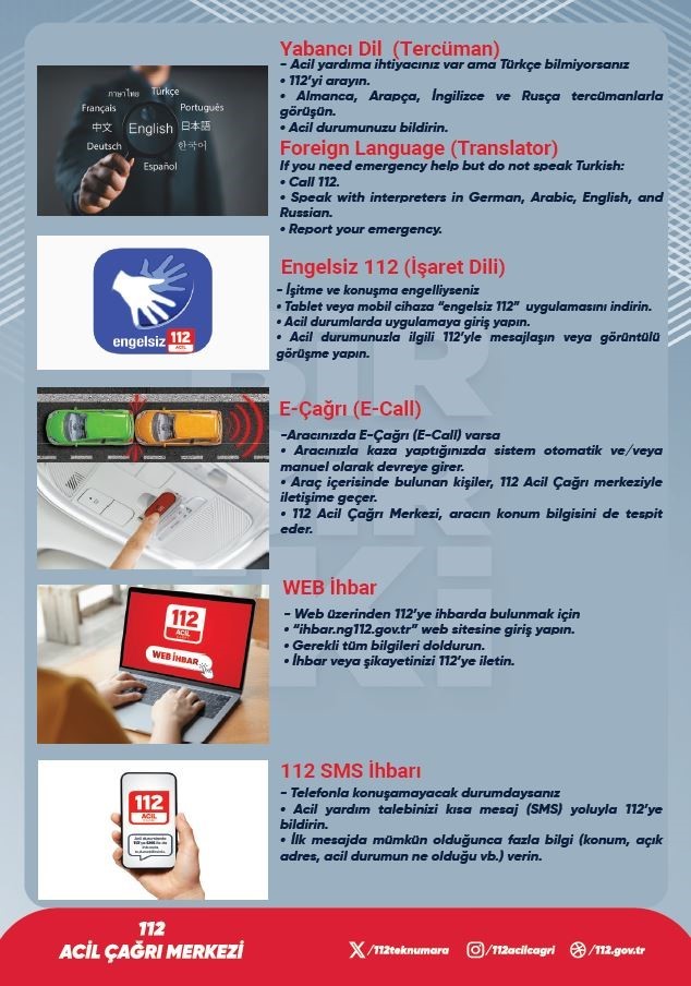 Ayrıca merkezin Türkçe haricinde İngilizce, Almanca, Arapça ve Rusça dillerinde de hizmet verdiği, personelin ise “Kriz Yönetimi, Mağdur Psikolojisi ve Temel Acil Çağrı Karşılama” gibi konularda düzenli eğitimlerden geçirildiği kaydedildi.