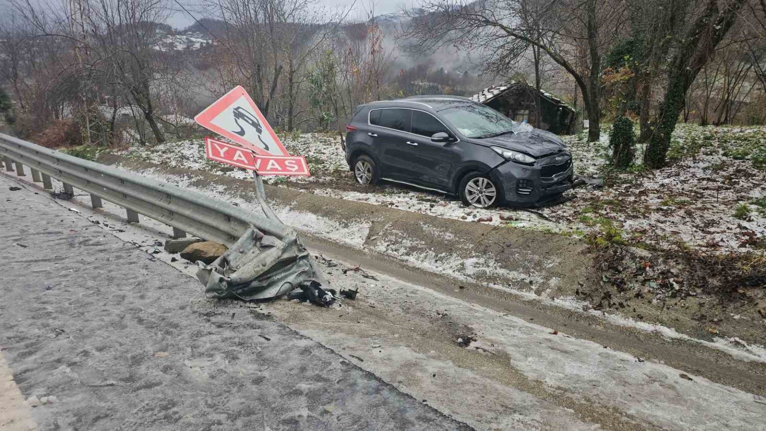 Zonguldak’ta kar yağışının etkili olduğu yolda kontrolden çıkan otomobil, bariyerlere çarpıp ters döndü. Kazada 2 kişi yaralandı.