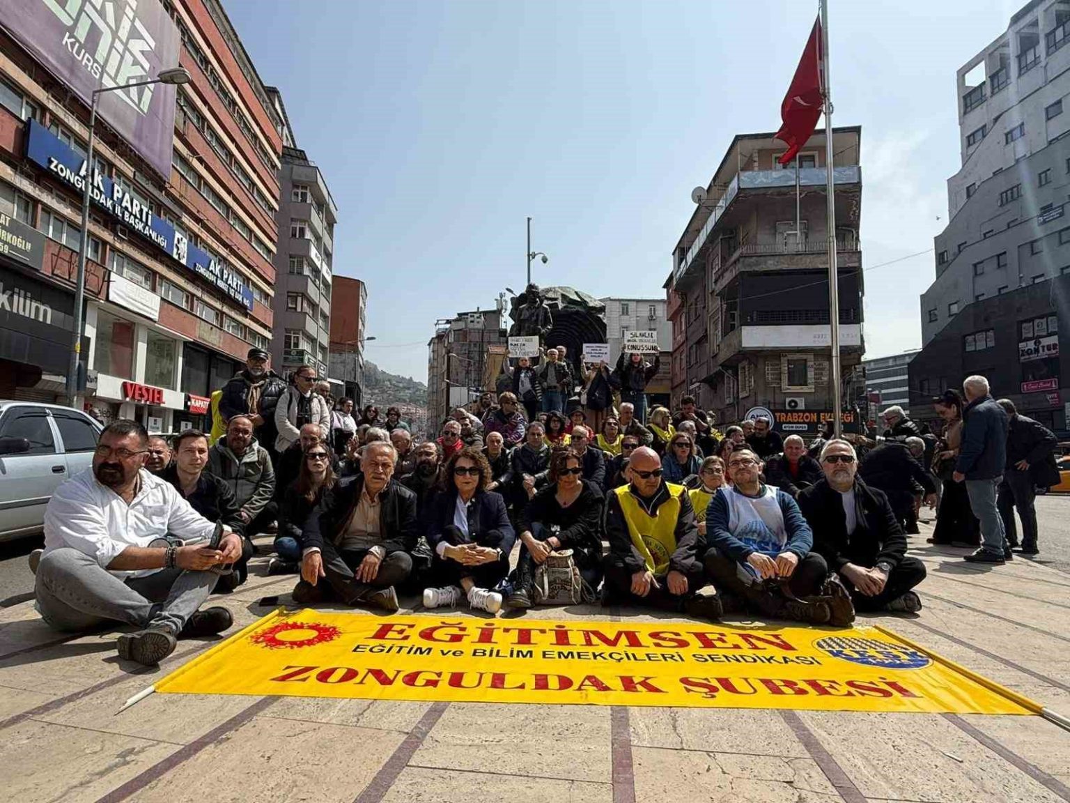 Kamu Emekçileri Sendikaları Konfederasyonu’e bağlı Eğitim ve Bilim Emekçileri Sendikası Zonguldak Şubesi üyeleri, Madenci Anıtı önünde oturma eylemi düzenledi.