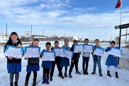 Akyaka’da köy okulunda öğrenciler karnelerini aldı. Karne sevinci yaşayan öğrenciler, 15 günlük…