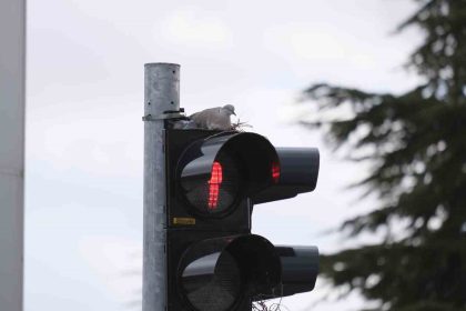 Karaman’ın en işlek kavşağındaki trafik lambasının üzerine yuva yapan kumru, sürücüler başta…