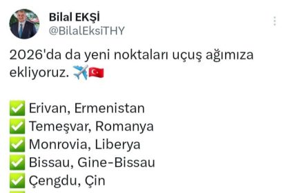 Türk Hava Yolları (THY) Genel Müdürü Bilal Ekşi, THY’nin 2026 yılı uçuş…