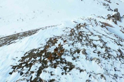 Adıyaman’da kar üzerinde kalabalık şekildeki yaban keçileri havadan görüntülendi. Koçali Köyü yakınlarında…