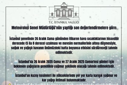 İstanbul Valiliği: “Cuma ve Cumartesi günü yüksek kesimlerde kar yağışı ihtimali bulunuyor”