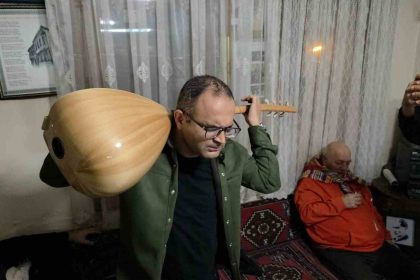 Kütahya’da dernek başkanı İsmail Barış’ın sazı ensesine koyarak tersten çalması görenleri hayretler…