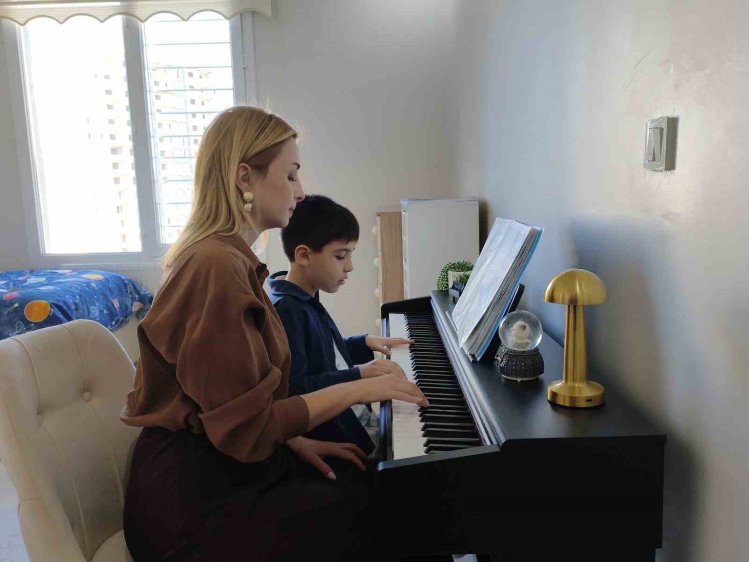 “Haftada bir gün piyano dersine gidiyoruz. Özellikle ders günlerinde, derste öğrendiği parça ya da egzersizleri mutlaka evde tekrar ettiriyorum. Genel olarak ise Emir, okul sorumluluklarını ve ödevlerini yerine getirdikten sonra piyanosunun başına geçip dosyasını açıyor ve şimdiye kadar öğrendiği tüm parçaları ve egzersizleri baştan sona en az bir kez tekrar ediyor. Sorumluluk bilinci yüksek bir öğrenci olduğu için bana çok fazla iş düşmüyor, kendisi güzel bir rutin oluşturdu. Bir ailenin çocuğuna verebileceği en büyük destek, ona kendini ifade etme fırsatı vermektir. İlgi ve yeteneklerini keşfedebileceği alanlar oluşturmaktır. Bu konuda hem maddi hem manevi destek olmaya çalışıyoruz. İki defa sahneye çıktı. Bu hissi anlatmak gerçekten çok zor, tarifi olmayan bir duygu. Çocuğunuzu sahnede, kendine güvenerek ve severek yaptığı bir işte mutlu görmek gururdan çok daha fazlasını hissettiriyor. O mutluluğu iliklerinize kadar yaşıyorsunuz.’’