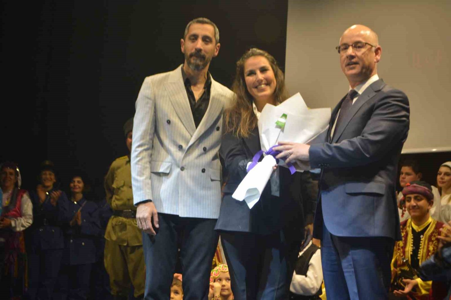 Gösterim sonunda sahneye çıkan Ayvalık Kaymakamı Hasan Yaman, dans tiyatrosunu hazırlayan Şeref Sakarya ve Güliz Sakarya bir buket çiçekle teşekkür etti.