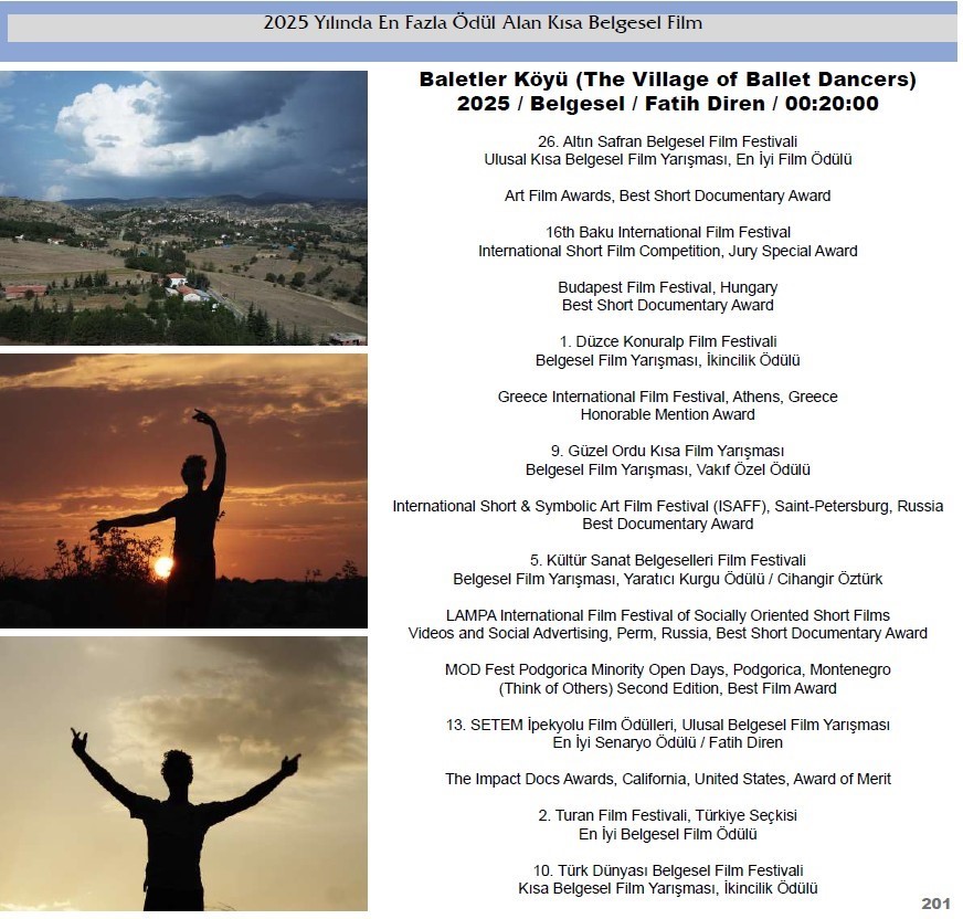 Çorum’un Başpınar Köyü’nün sıra dışı hikayesini anlatan ’Baletler Köyü’ belgeseli ayrıca 25 farklı festivalde gösterim şansı yakalayarak geniş bir uluslararası izleyici kitlesine ulaştı. Anadolu’nun küçük bir köyünden çıkıp Devlet Opera ve Balesi sahnelerine uzanan 13 baletin gerçek yaşam öyküsünü etkileyici bir dille anlatan belgesel, kısa sürede katıldığı uluslararası festivallerden birçok ödülle dönerek, 2025’in en başarılı kısa belgeseli unvanını elde etti. Filmin ulaştığı ödül ve gösterim istatistikleri, araştırmacı Hayri Çölaşan tarafından derlendi. Yoksulluk, toplumsal önyargılar ve zorluklar karşısında sanata tutunmanın mümkün olduğunu gözler önüne seren yapım, kısa sürede katıldığı festivallerden birçok ödülle dönerek 2025’in en başarılı kısa belgesellerinden biri olarak öne çıktı. ’Baletler Köyü’, Yunanistan Uluslararası Film Festivali’nden Onur Ödülü, Makedonya Sanat Film Festivali’nden ’En İyi Kısa Belgesel’ ödülü gibi prestijli başarıların yanı sıra 26. Uluslararası Altın Safran Belgesel Film Festivali’nde ’En İyi Kısa Belgesel’, Karadağ MOD Fest Podgorica’da ’En İyi Film’ ve Düzce Konuralp Film Festivali’nde ’belgesel’ kategorisinde ikincilik ödülüne layık görüldü. Uluslararası festival yolculuğunu sürdüren film, ABD’de Cranford Film Festivali, Authentic Global Film Awards ve Emberlight International Film Festival ile Fransa’daki SEE Film Festival’in resmi seçkilerinde yer aldı; Arnavutluk’taki Tirana Mediterranean Film Festival’de ise finalist oldu. Belgeselin gördüğü yoğun ilgiye ilişkin değerlendirmede bulunan yönetmen Fatih Diren, filmin yalnızca Türk sinemasını değil, Anadolu’dan çıkan samimi ve ilham verici hikayeleri de dünyaya taşıma gücünü kanıtladığını söyledi. Diren; “Film Çorum’un, Başpınar Köyü’nün ve ülkemizin adını dünya çapında duyurdu. Rusya’da filmi izleyen izleyiciler ‘Bu gerçek bir hikaye mi?’ diye sordu. Gerçekten çok ilginç ve etkileyici bir hikaye” ifadelerini kullandı.