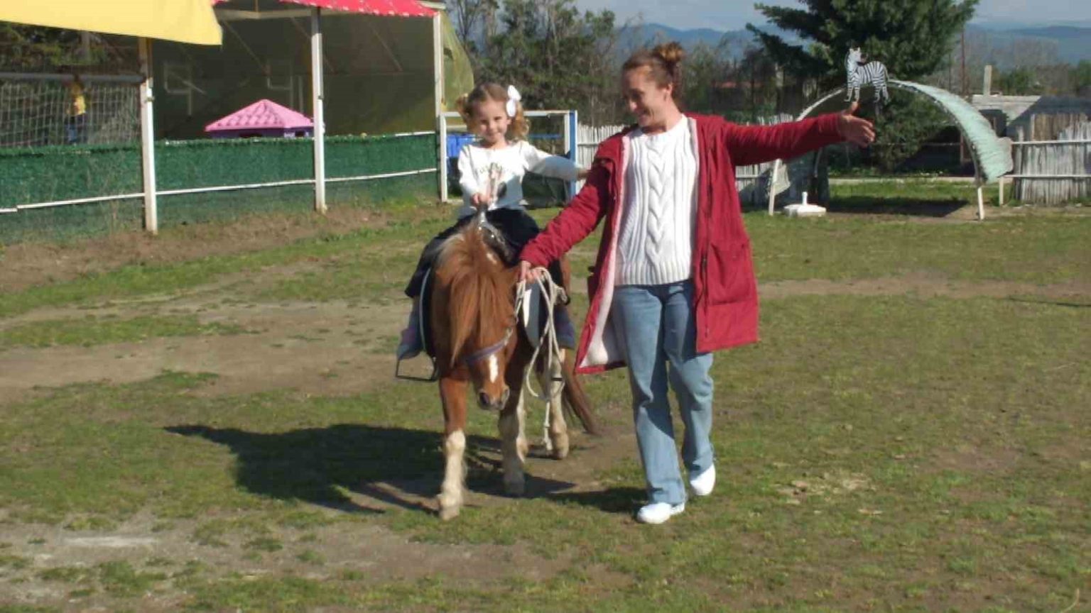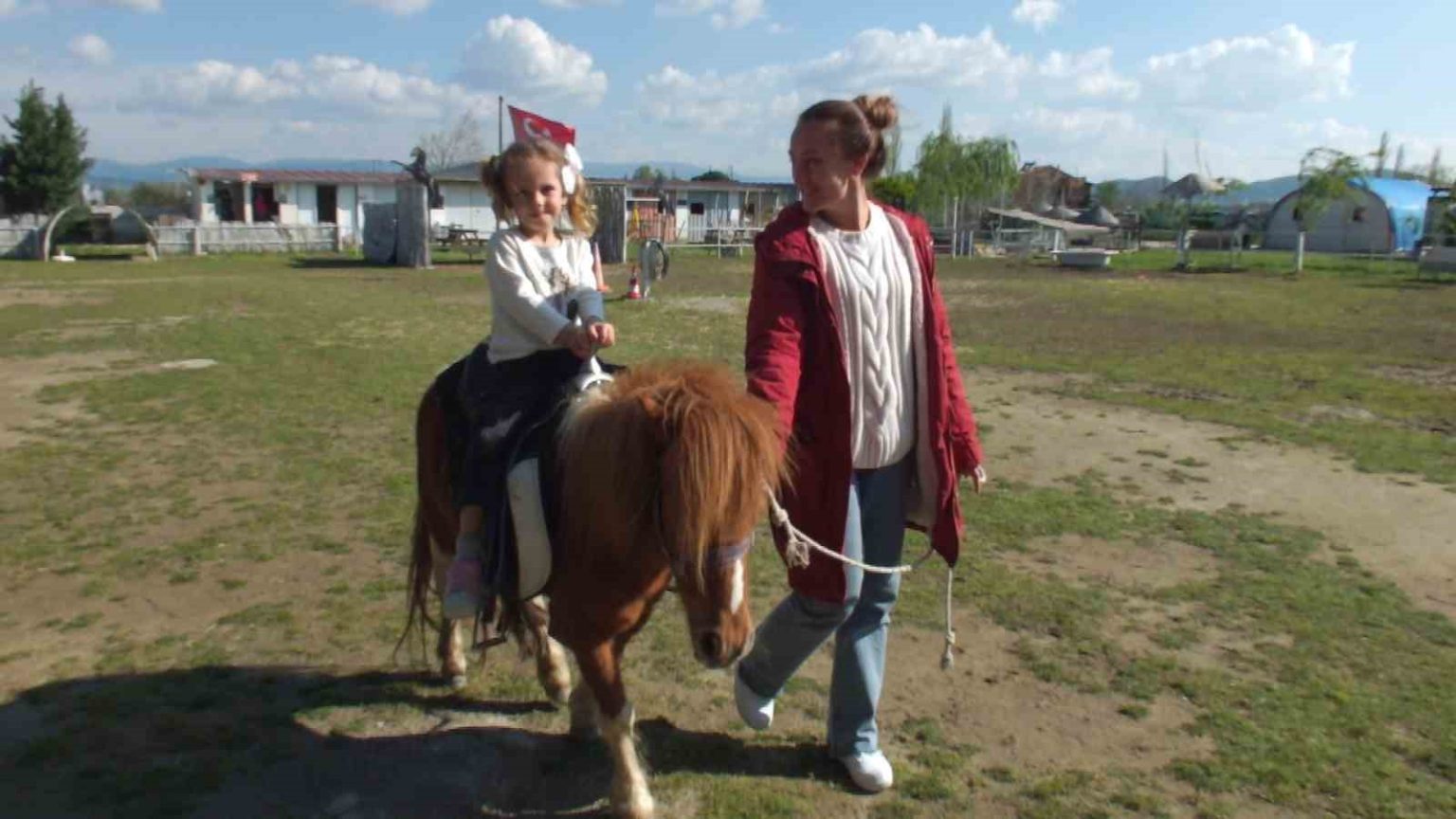 Burhaniye ilçesinde, velileriyle birlikte Ören Meço Tatil Sitesi yanında bulunan Mila Garden işletmesine gelen çocuklar, at binerken mutluluk yaşadı. Midilli Pony atlarına binen çocuklar at binmeyi herkese tavsiye ettiklerini söyledi,