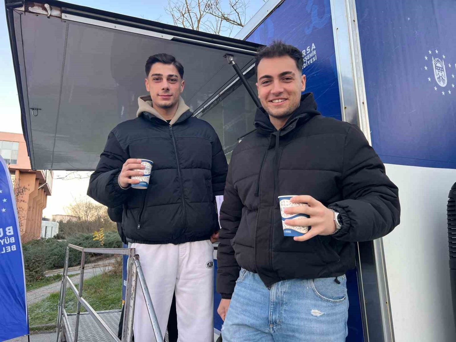 Soğuk kış günlerinde üniversite öğrencilerini yalnız bırakmayan Bursa Büyükşehir Belediyesi, Bursa Uludağ Üniversitesi ve Bursa Teknik Üniversitesi’nde eğitim gören öğrencilere her sabah ücretsiz sıcak çorba ve ekmek ikram ederek hem moral veriyor hem de destek oluyor.