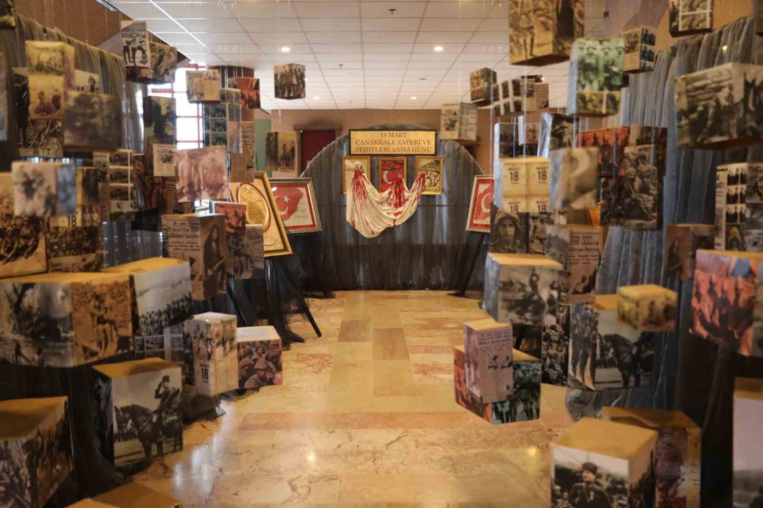 Enstitüde görevli 20 kişi tarafından 3 aylık çalışma sonucu oluşturulan sergide, sülüs yazı çeşidi ile beş farklı kalem ölçüsünde kubbe şeklinde, dalgalı ve aharlı ebru kağıdı üzerine yazılar yazıldı. Çanakkale Şehitleri Anıtı, akkase tekniği kullanılarak yapıldı ve taş kısmında cesareti temsil eden 300 adet kaplan gözü doğal taş kullanılarak eser tamamlandı. 18 Mart Çanakkale Savaşı’nda şehit olan askerlerin anısına, Çanakkale ruhunu yansıtmak amacıyla diorama (3 boyutlu modelleme) çalışması da yapıldı.