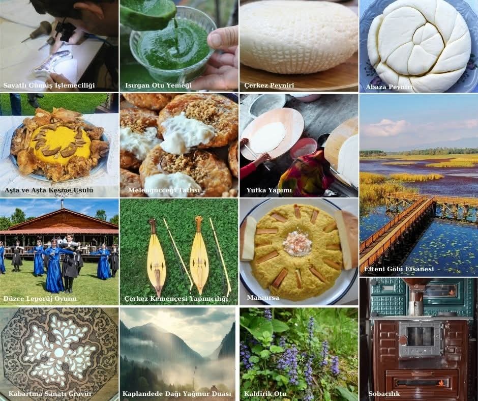 2026 yılı itibarıyla Düzce’nin somut olmayan kültürel miras unsurları; Kaplan Dede Dağı Yağmur Duası, Kabartma Sanatı (Gravür), Savatlı Gümüş İşlemeciliği, Çerkez Kemençesi Yapımcılığı, Aşta ve Aşta Kesme Usulü, Efteni Gölü Efsanesi, Düzce Leperüş Oyunu, Kaldirik Otu, Melengücceği Tatlısı, Sobacılık, Çerkez Peyniri, Abaza Peyniri, Isırgan Otu Yemeği, Yufka Yapımı, Mamursa, Şıra Yapımı, Sepetçilik ve Bıçakçılık olarak sıralandı. Somut Olmayan Kültürel Miras Envanter Çalışmaları, Kültür ve Turizm Bakanlığı Yaşayan Miras ve Kültürel Etkinlikler Genel Müdürlüğü tarafından, İl Kültür ve Turizm Müdürlükleri koordinasyonunda illerde oluşturulan il tespit komisyonları aracılığıyla yürütülüyor. İl tespit komisyonları yılda iki kez toplanarak, iller tarafından belirlenen unsurlara ilişkin teklifleri değerlendirilmek üzere Bakanlığa sunuyor. Bu kapsamda bugüne kadar yürütülen çalışmalar sonucunda, Düzce Somut Olmayan Kültürel Miras İl Tespit Komisyonu tarafından hazırlanan ve Kültür ve Turizm Bakanlığı Yaşayan Miras ve Kültürel Etkinlikler Genel Müdürlüğüne gönderilen 18 unsur, uygun görülerek Ulusal Envanter Listesi’ne kayıt altına alındı.