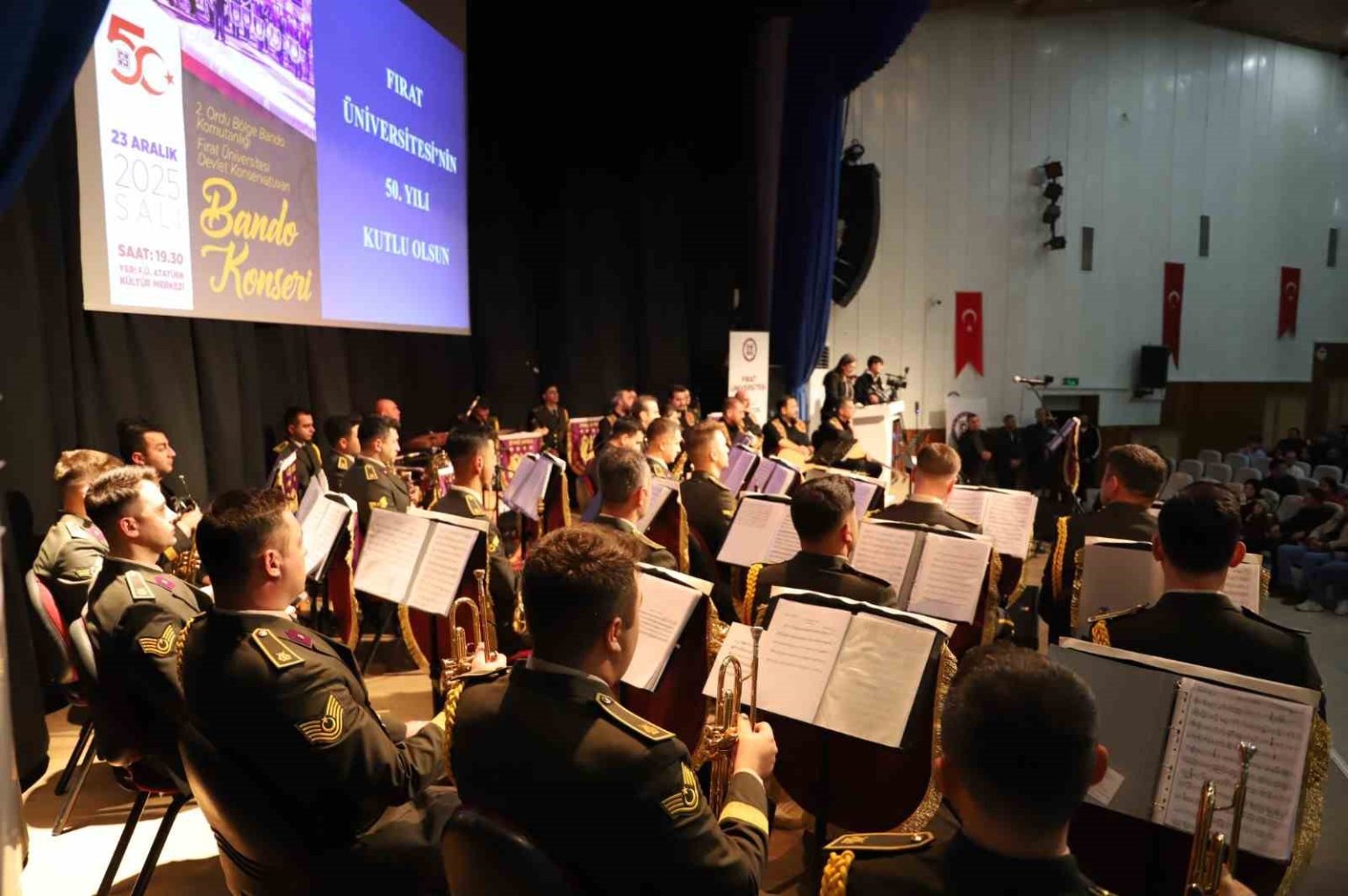 Fırat Üniversitesi’nin kuruluşunun 50. yıl dönümü etkinlikleri kapsamında, Malatya 2. Ordu Bölge Bando Komutanlığı ile Fırat Üniversitesi Devlet Konservatuvarı iş birliğinde düzenlenen ortak konser, unutulmaz bir müzik ziyafeti sundu. Atatürk Kültür Merkezinde gerçekleştirilen konser programına; Fırat Üniversitesi Rektör Vekili Prof. Dr. İrfan Kaygusuz, Rektör Yardımcısı Prof. Dr. Mehmet Yılmaz, Genel Sekreter Prof. Dr. Sinan Akpınar, akademisyenler, öğrenciler ve çok sayıda vatandaş katıldı.
