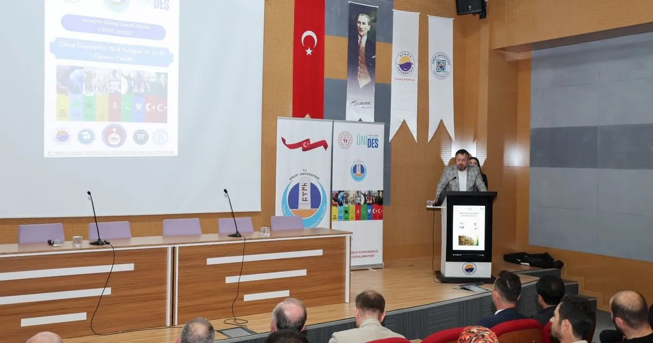Sinop Üniversitesi Şehit Ömer Can Açıkgöz Konferans Salonu’nda gerçekleştirilen programda Ondokuz Mayıs Üniversitesi(OMÜ) Öğretim Üyesi Doç. Dr. Murat Emre Şahin, “Kimlik ve Kültür Bağlamında Dil ve Ortak Alfabe Meselesi” başlıklı sunumunda dilin kimlik ve kültür üzerindeki etkilerini ele aldı. Şahin, ortak alfabe fikrinin Türk dünyasında kültürel birlikteliği güçlendirecek önemli bir adım olduğunu vurguladı.