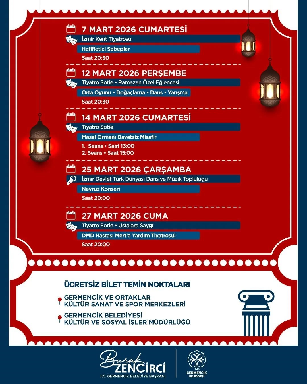 Tüm etkinliklerin ücretsiz olacağını belirten Belediye Başkanı Zencirci, biletlerin Germencik ve Ortaklar Kültür Sanat ve Spor Merkezleri ile belediyenin Kültür ve Sosyal İşler Müdürlüğü’nden temin edilebileceğini ifade etti.