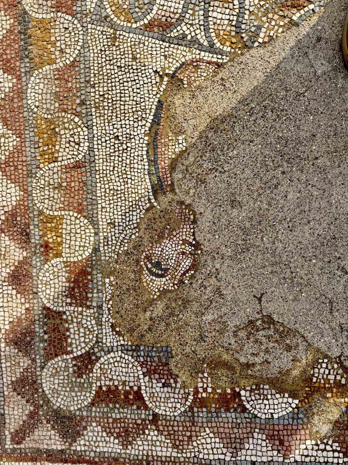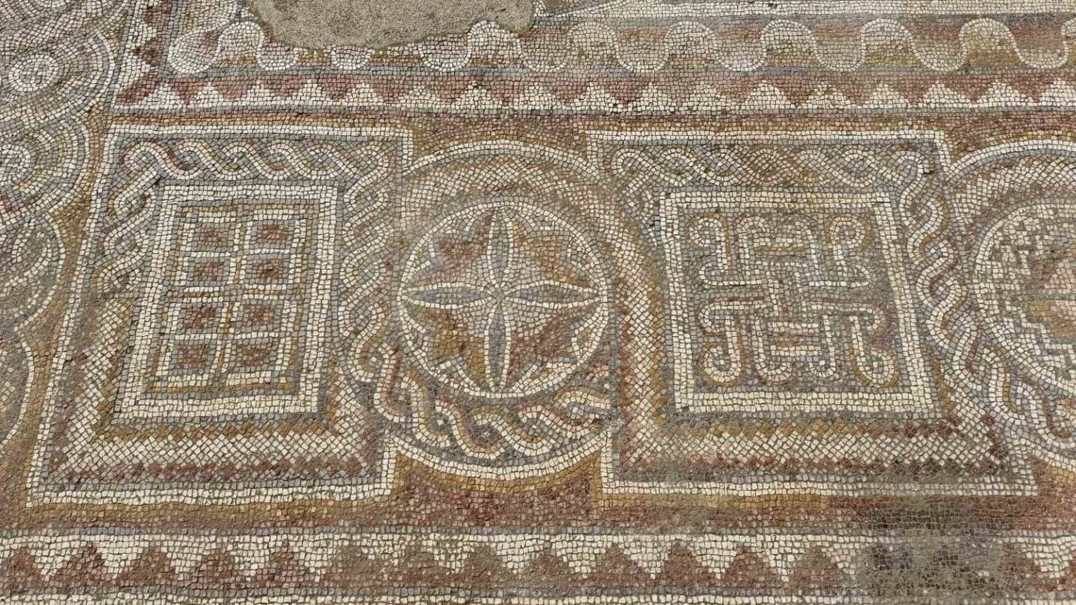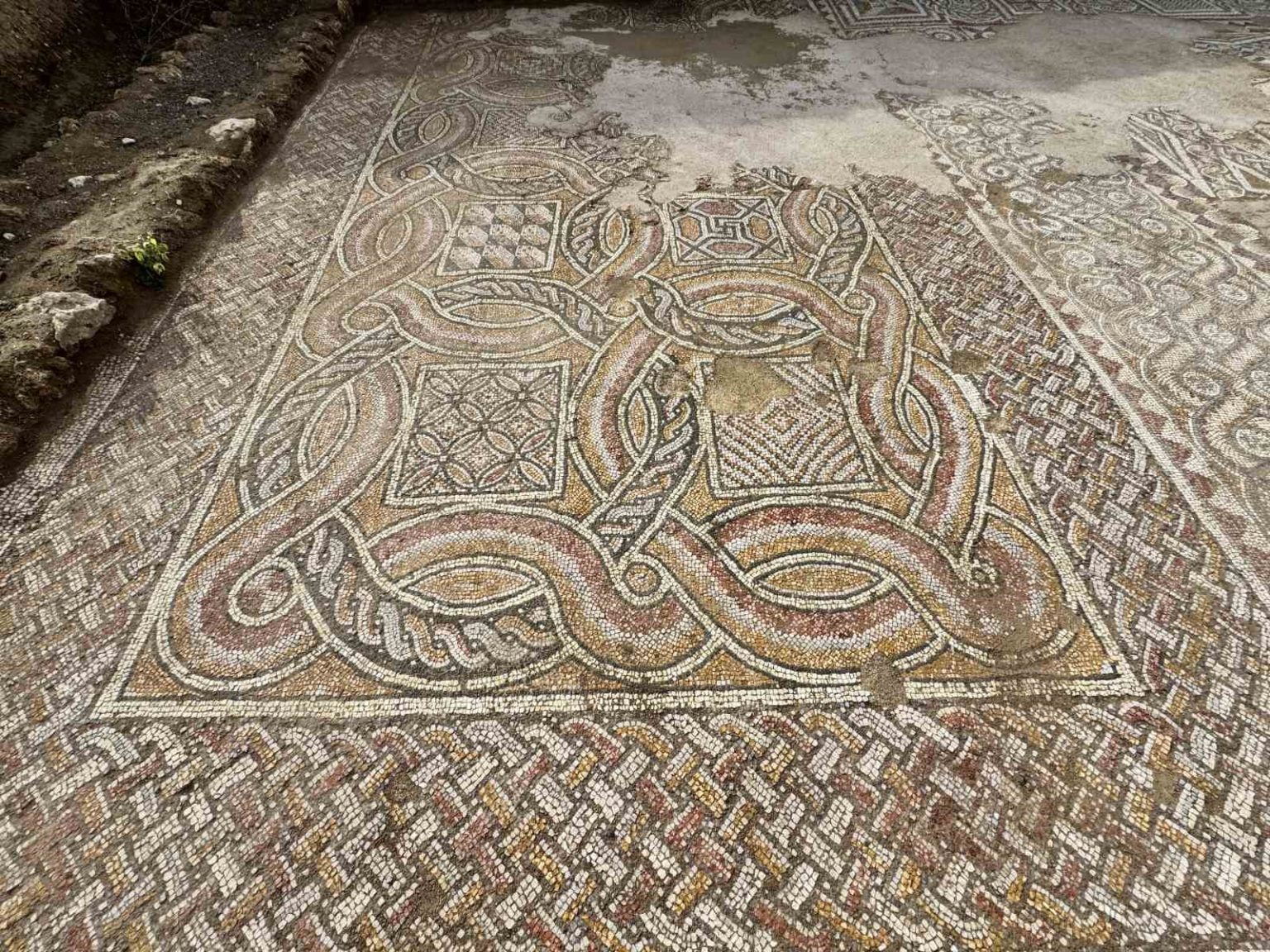 “Şu ana kadar tespit ettiğimiz desenler, dalgalı kurdele motifi var. 8 kollu yıldız merkezinde işlemiş ve bu sekiz kollu yıldızın tam ortasına da bir antitetik duruşlu tavus kuşları sahnelenmiş. Yine çeşitli geometrik motifler işlenmiş burada. Süleyman düğümleri var panolar içerisinde. Aslında burada gerçekten mozaikler bir halı deseni gibi işlenmiş. Ve o hala canlılığını o rengini koruyarak da günümüze ulaşmış. Şu anda mozaiklerimizin geçici üstlerini korumaya da alacağız. Ama bu yılın sonuna kadar inşallah ziyaretçilerimizin görebileceği bir şekilde de burayı teşhire açacağız.”