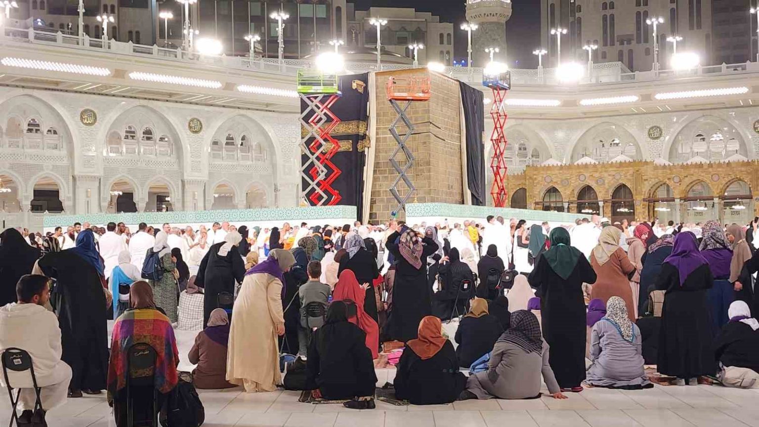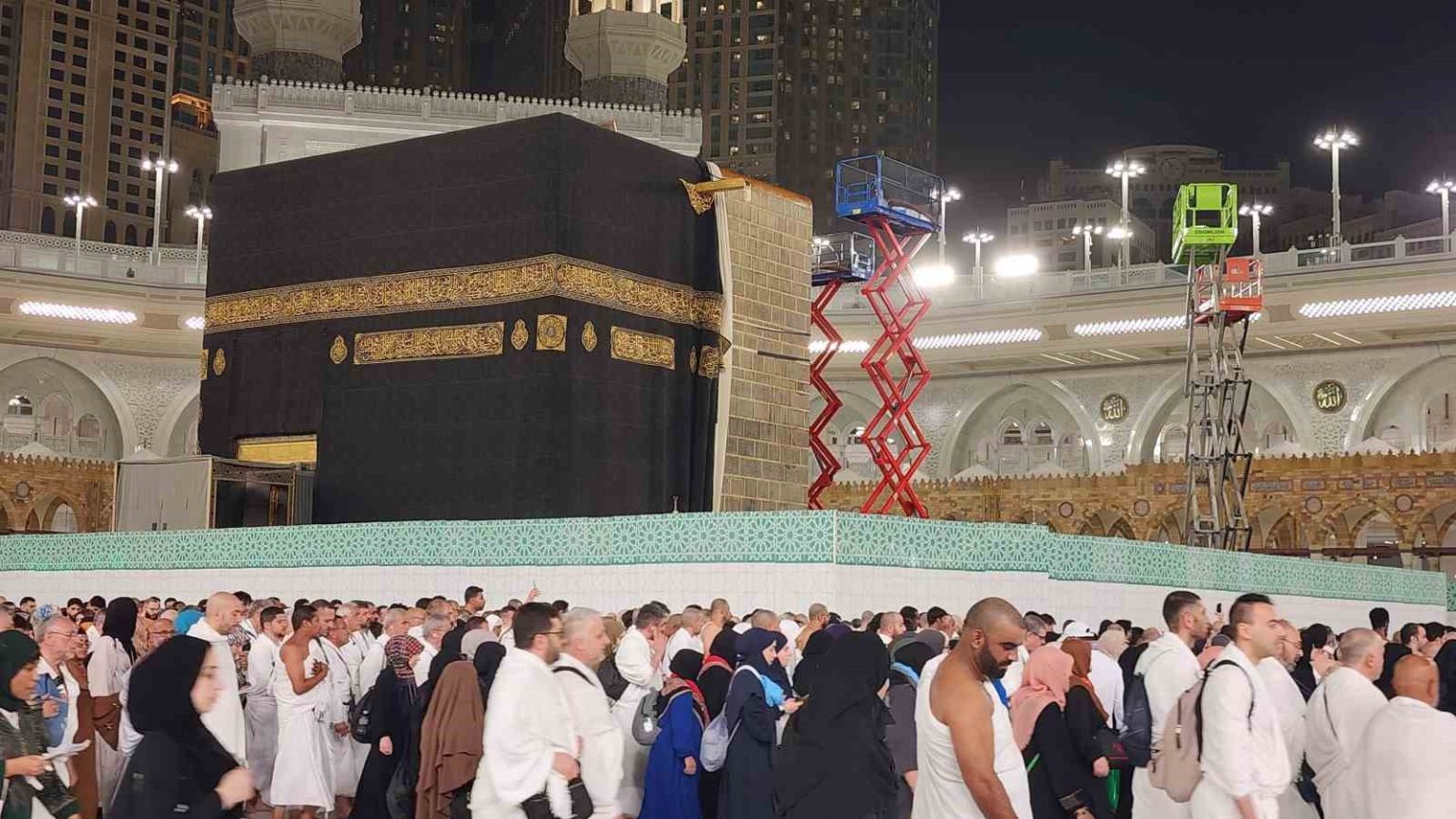 Erzurum’dan kutsal topraklara umre ziyareti yapan vatandaşlar, öğle namazı sonrası tavaf yaparken Kabe-i Muazzama’daki tamirata şahitlik etti. İbadetlerine devam eden Müslümanlar, hemen yanlarındaki 5 gündür devam eden çalışmayı heyecanla izledi.