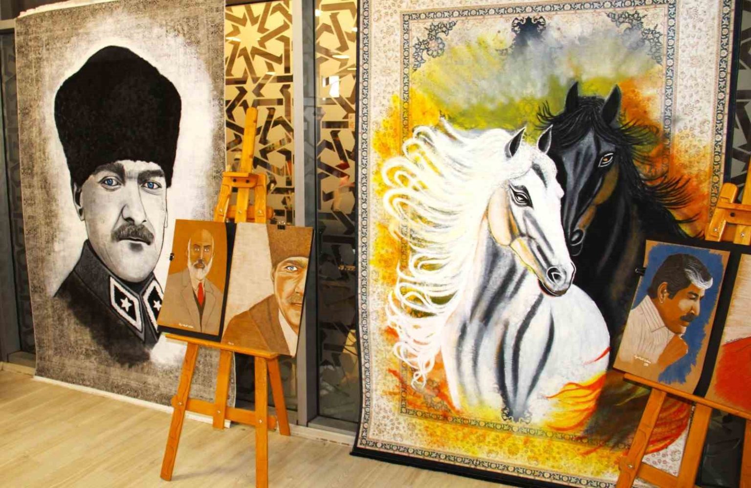 Kahramanmaraş’ın Afşin ilçesinde, şehitlerin karakalem portrelerini çizerek ailelerine hediye etmesiyle “Şehitlerin Ressamı” olarak tanınan ressam Ülger Gülbahar, halıları tuval olarak kullanarak özgün eserler ortaya koyduğu ilk kişisel sergisini açtı.