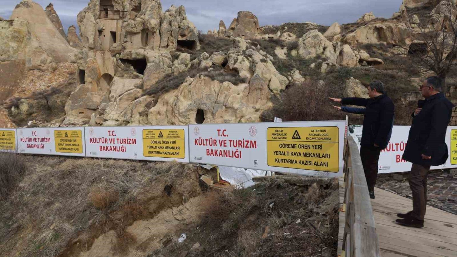 Kapadokya Alan Başkanı A. Cem Aslanbay; Göreme Ören Yeri ile Göreme Açık Hava Müzesi yolu üzerinde devam eden yeraltı kaya mekânları kurtarma kazı alanında incelemelerde bulundu.