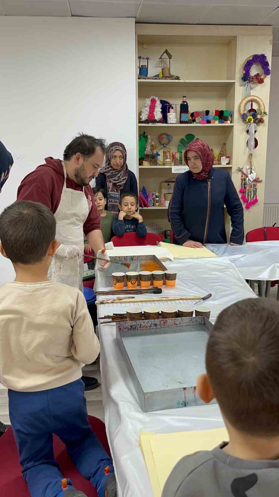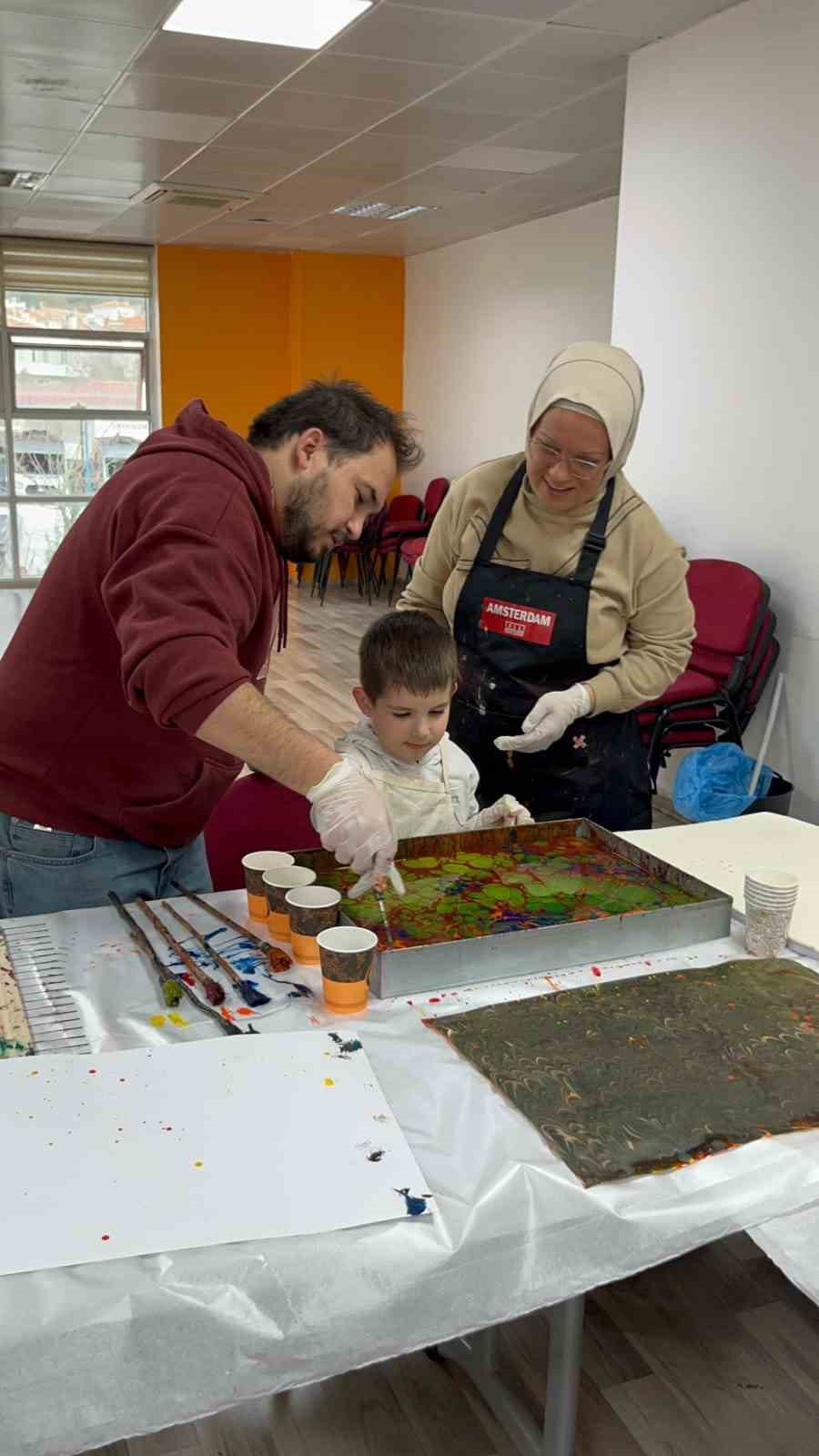 Menteşe’de “Okullar Merkezimizde” programı kapsamında düzenlenen etkinlikte, aileler ve çocuklar geleneksel Türk sanatlarından ebru sanatı ile buluştu.