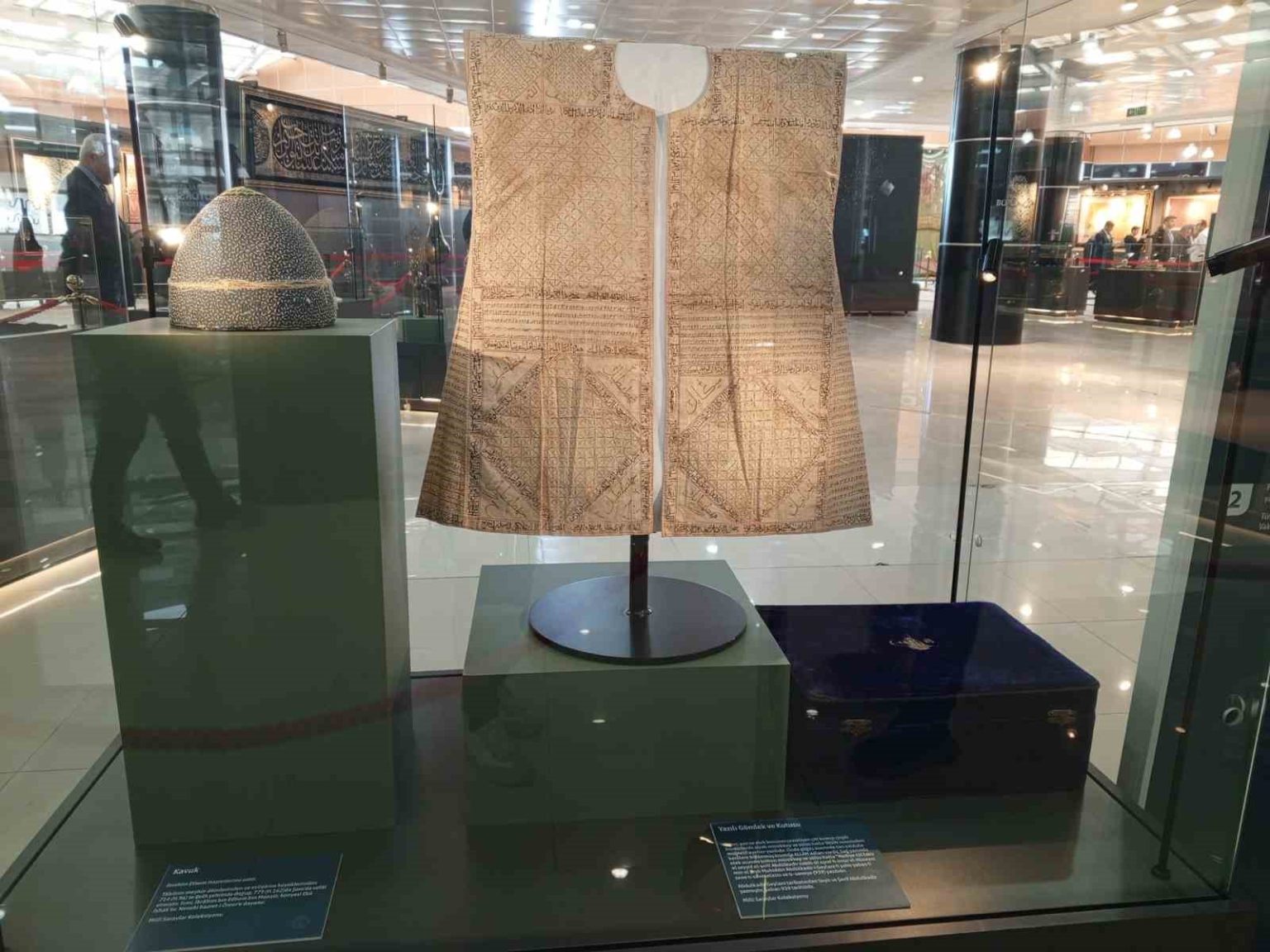 99 eserin yer aldığı sergide Kabe örtüleri, Ravza-i Mutahara örtüleri, Peygamber Efendimiz Hz. Muhammet’in Saç-ı Şerifi ve Sakal-ı Şerifi’nin yanı sıra ayrıca Vakıflar Genel Müdürlüğüne bağlı müzeler, teberrükat depoları ve vakıf kayıtları arşivinden seçilen kutsal emanetler ve taşınır vakıf kültür varlıkları yer alıyor.