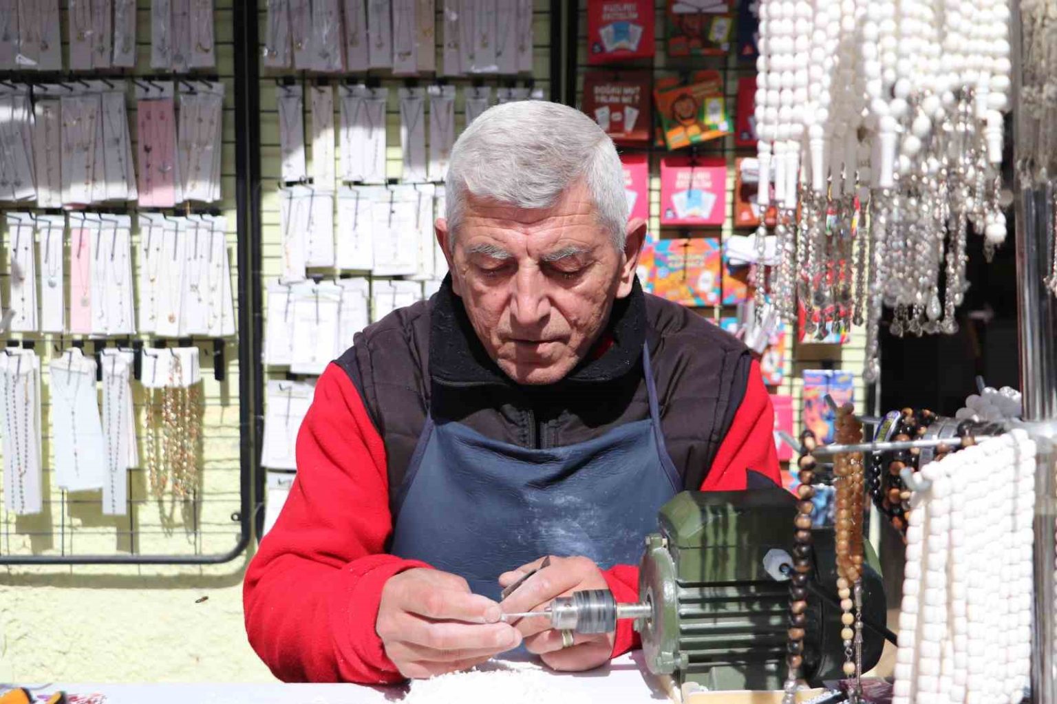 “Bütün ürünlerimizi satıyoruz ama biz lüle taşımızın özelliklerini, faydalarını anlattığımızdan dolayı lüle taşından tespih ve bilekliği çok satarım. Tabii sadece bunlar değil; tespih var, bileklik var, kolyeler var. Takılarımızın hepsini lüle taşı ile süslüyoruz. Bayram yoğunluğu ile birlikte bütün ürünlerimi satıyorum.”