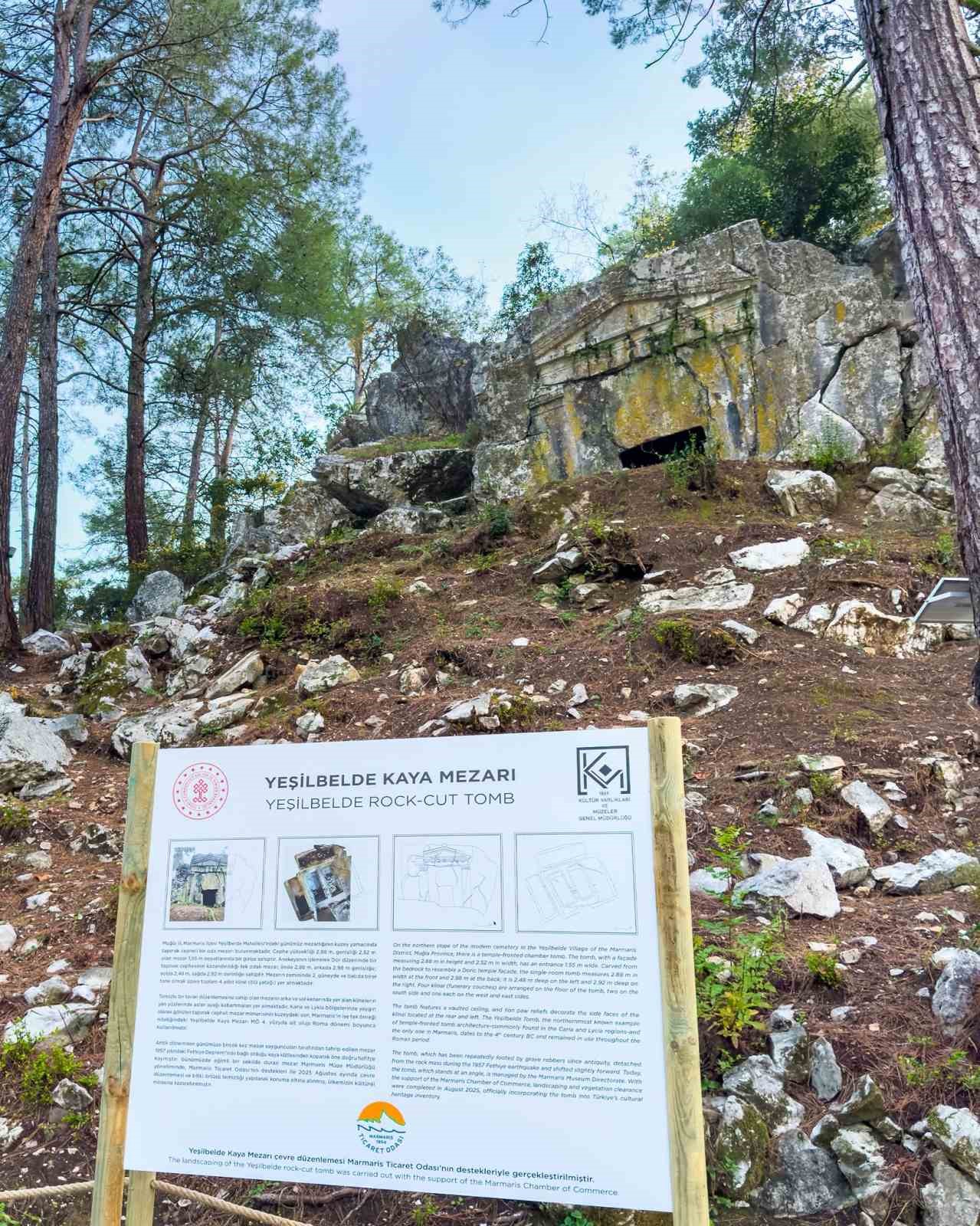 Marmaris genelinde sürdürülen kültürel mirası koruma çalışmalarına bir yenisi daha eklendi. Hakkında sınırlı sayıda araştırma bulunan ve Kültür ve Turizm Bakanlığı tarafından korunması gerekli kültür varlığı olarak tescillenen Yeşilbelde Kaya Mezarı, Marmaris Ticaret Odası’nın destekleri, Marmaris Müze Müdürlüğü’nün denetimi ve MSKÜ Arkeoloji Bölümü Öğretim Üyesi Doç. Dr. Mehmet Gürbüzer’in danışmanlığında gerçekleştirilen çalışmalarla güvence altına alındı. Çalışmalar kapsamında mezarın çevresindeki yoğun bitki örtüsü temizlendi, çevre düzenlemesi yapıldı, güvenlik şeridi oluşturuldu. Alan, uyarı ve bilgilendirme tabelalarıyla donatılırken, aydınlatma ve güvenlik kameraları da yerleştirildi.
