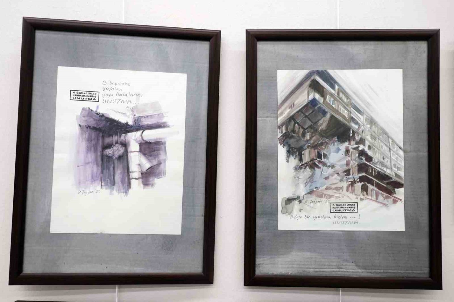 Ressam Ayten Taşpınar sergideki resimlerin deprem bölgesinde çekilmiş fotoğrafların orijinaline sadık kalınarak resmedildiğini belirtti. 39 sulu boya resimden oluşan serginin açılışında, yaşamını yitirenlerin anısına bir dakikalık saygı duruşunda bulunuldu.
