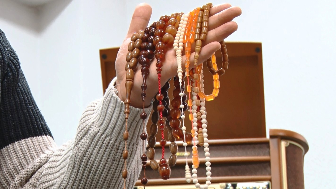 Tespih yapım sürecini anlatan Koyuncu, “Bu süreç bir aşkın başlangıcı gibi diyebiliriz. İlk önce malzememizi değerlendiririz. En güzel modeli nasıl yapabiliriz diye bir taslaklama işlemi yaparız. Bunu yaptıktan sonra kesime geçeriz. Kesimi yaptıktan sonra zımparasına geçeriz. Delimi var. Tekrar şekil verme işlemi var. Zımparası var tekrar. Sonra cilalama işlemi vardır. Daha sonra da tespih dizilimiyle aşkımız gerçekleşmiş olur. Minimum bir tespih 1 gün sürer. Malzemenin işçiliğine göre, sertliğine göre de bu birkaç gün daha fazla sürdüğü olabiliyor. Gözde malzemelerimiz, nadir katalinlerden başlayıp doğal gruplar, kukadır, hayvansal ürünler, ağaç gruplarımız, damla kehribarlarımız var. Türkiye’mizin oltuları meşhur, onlardan işleyebiliyoruz. Genelde bu malzemeleri çalışıyoruz” diye konuştu.