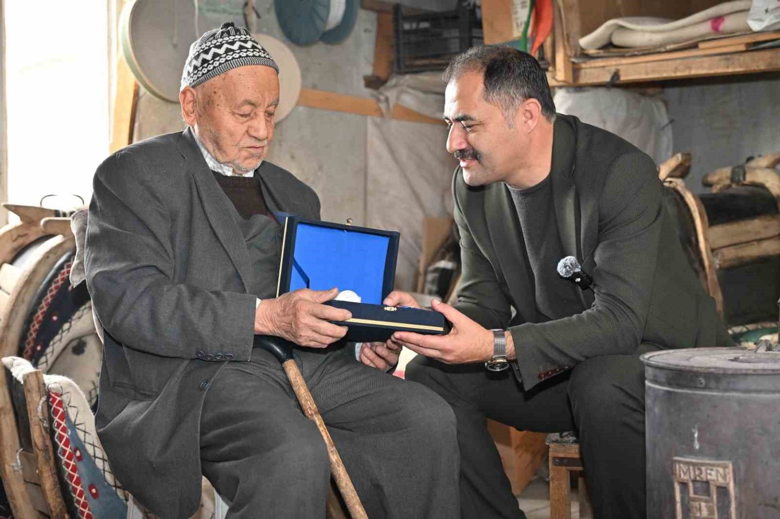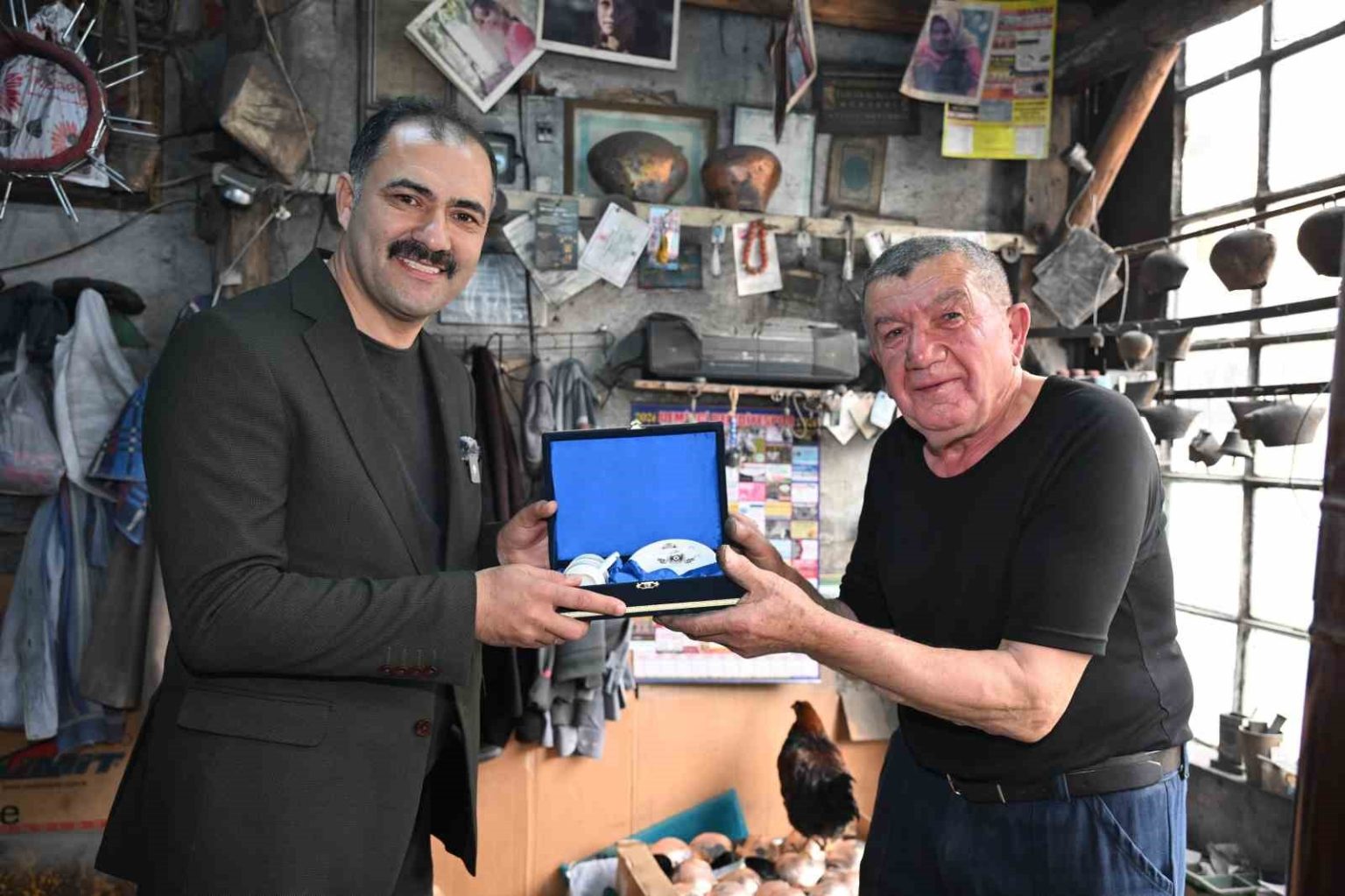 Belediye Başkanı Erkan Kara ziyarette ustalara ve sanatkarlara günün anısına fincan takımı hediye etti.