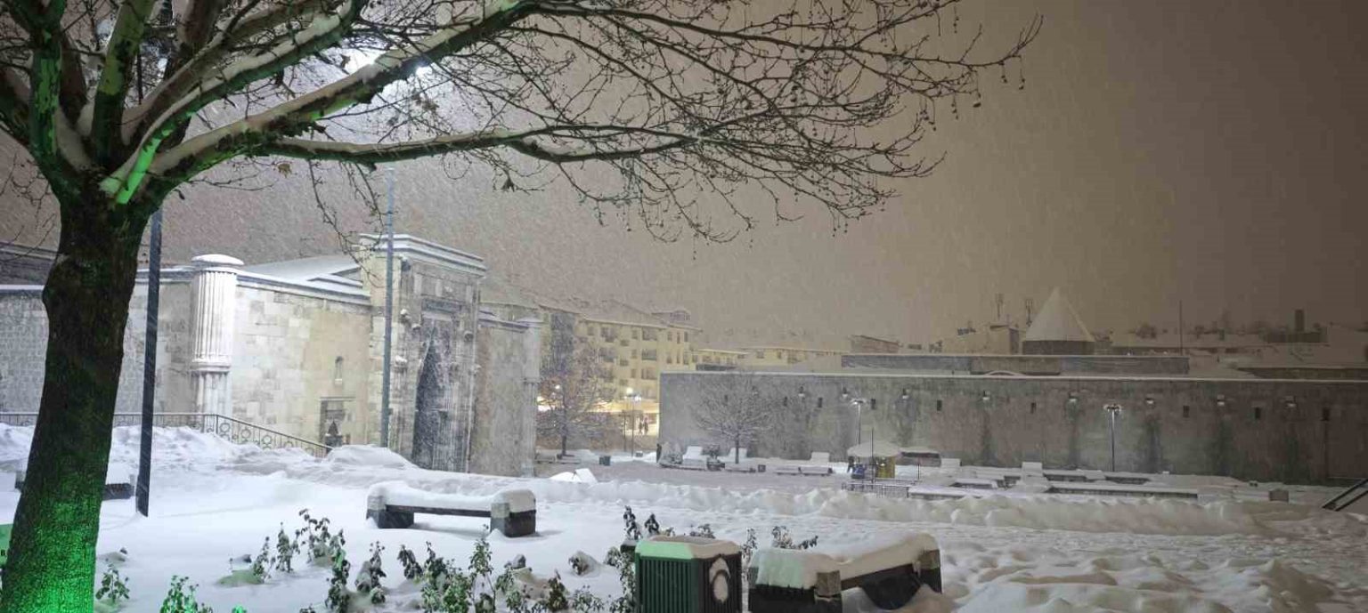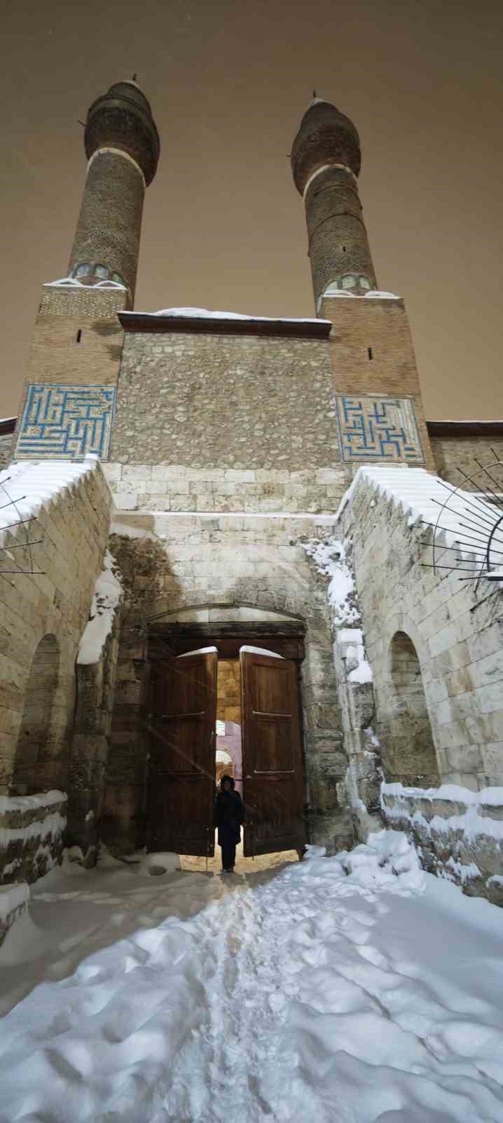 Selçuklu, Osmanlı ve Cumhuriyet dönemi eserleri bir arada bulunduran Sivas Tarihi Kent Meydanı’nı adeta yağan karla birlikte beyaz gelinliğini giydi. 8 asırdan fazladır tüm heybetleriyle ayakta kalmayı başaran Şifahiye Medresesi, Çifte Minareli Medrese ve Buriciye Medresesi’nde belgesel tadında görüntüler ortaya çıktı. 8 asırlık tarihi yapıların çatılarındaki su arklarında 1 metreyi bulan buz sarkıtları oluştu. Osmanlı dönemi eseri olan Kale Camisi, Kongre Müzesi ve tarihi Sivas Valilik binası da bu görsel şölene katkı sundu.