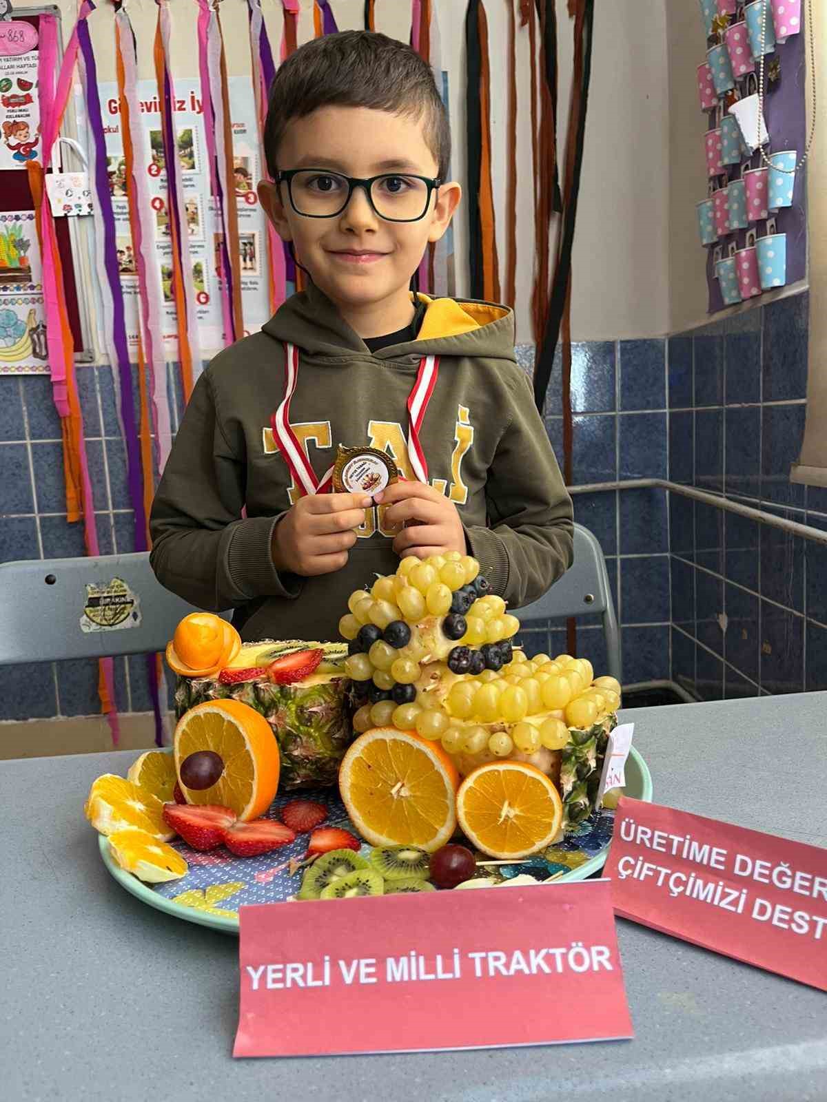 Tutum, Yatırım ve Türk Malları Haftası etkinlikleri Arslanbey İlkokulu’nda farklı bir boyut kazandı. 2-A sınıf öğretmeni Mefküre Çakır tarafından organize edilen etkinlikte, öğrencilerin yerli mallarına olan ilgisini artırmak ve aile bağlarını güçlendirmek amacıyla “En İyi Meyve Tabağı” yarışması düzenlendi. Türkiye Yüzyılı Maarif Modeli uygulamaları ve 2025 Aile Yılı ilan edilmesi dolayısıyla velilerin de aktif katılım sağladığı etkinlikte, sınıflar adeta birer sanat atölyesine dönüştü. Çeşitli meyve ve sebzeleri kullanarak hayal güçlerini sergileyen öğrenci ve veliler; hayvan figürlerinden doğa manzaralarına kadar birbirinden ilginç ve estetik sunumlar hazırladı.